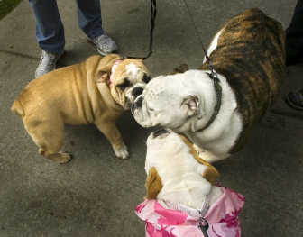 Rocky and Libby were joined by 6-month-old Finnley, a buff-and-white bulldog sporting a pink camouflage jacket, and Major Leagues Ruby Dooby (Ruby for short) a brindle-and-white, but naked, bulldog.