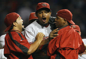 Hernandez, the 1997 World Series MVP for Florida, gave Arizona another lift. He allowed five hits and a run in six innings, overcoming five walks. The Diamondbacks’ defense turned four double plays, three while Hernandez was pitching.