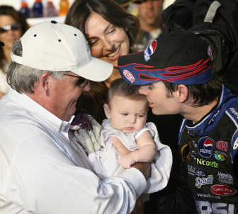 With his victory Sunday at Talladega, Gordon scored his fifth win of the season – but first since daughter, Ella, was born June 20. As he drove his car toward the celebration, he became emotional when he realized he would be greeted for the first time by both his wife, Ingrid, and their only child.