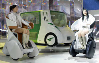 Besides the scooter-like I-Real, which President Watanabe rode onstage, Toyota Motor Corp. showed a stripped down experimental version of its popular Prius gas-electric hybrid.