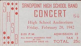 , OrangeTV has posted this shot of a 1942 ticket to a Sandpoint High School Band concert. This was so far back that I doubt Marianne Love remembers who was playing. But I’m not sure. Check out the ticket price. Can you remember paying 25 cents for a ticket or gallon of gas?
