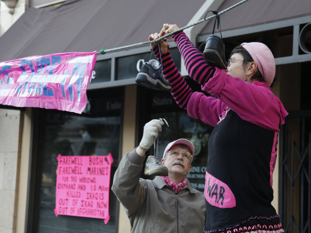 Code Pink members Fred Bialy, left, and Toby Blome, right, both of El Cerrito, Calif., hang shoes outside a Marine Corps recruiting station during a protest in Berkeley, Calif., Wednesday. In solidarity with an Iraqi journalist who threw his shoes at President Bush during a Baghdad press conference Sunday, the anti-war activists held up shoes during an event billed as a Farewell Kiss Shoe-In.(AP Photo/Eric Risberg)