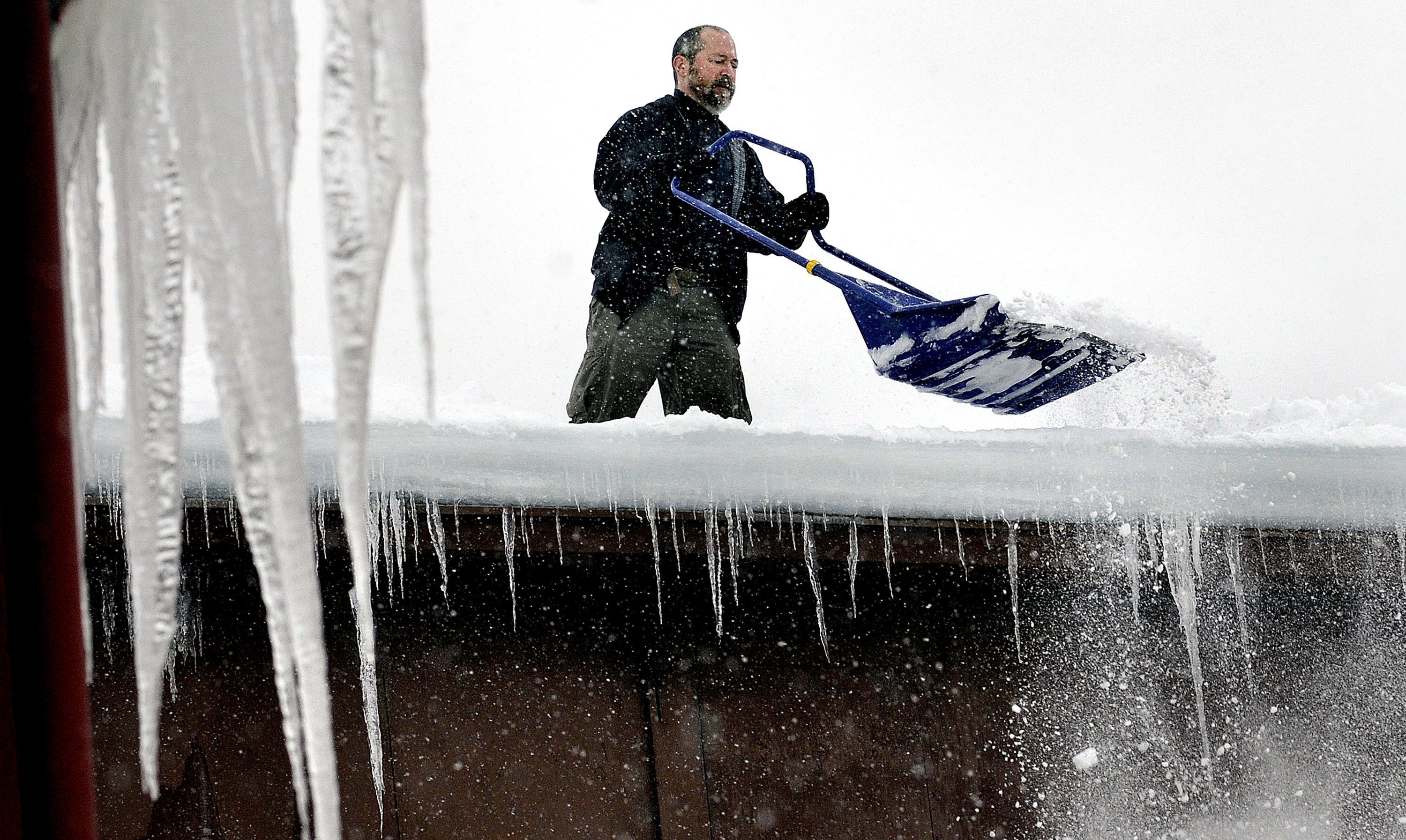 Dan Dolezal clears the snow from the roof of his business, Camera Corral, in Coeur d’Alene earlier this week. (AP Photo/KATHY PLONKA, The Spokesman-Review)