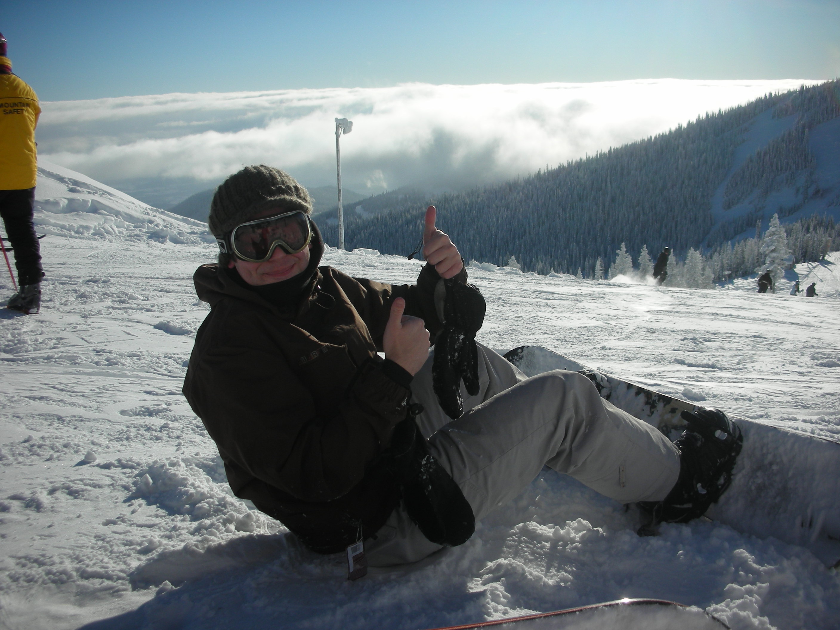 Mrs. O and I’ll be ushering out the old year with my siblings, their spouses, and my mother at Frito Ray’s place tonight. Mebbe a movie first. ‘Tis nice to have family around for holidays and special occasions like birthdays and graduations. I raised two kids in the Northwest without a lot of family around. Belatedly, they’ve begun to be acquainted with the extended families on both sides. I hope you’re enjoying the holiday season between storms and are gearing up for the 2009 debut of Huckleberries Online. I can’t wait to begin pestering Blogmeister Ryan again re: special features and layout of the blog. For example, I want my cartoon mug switched to this blog and I want the color changed to a nice huckleberry purple. Meanwhile, I’d like to draw your attention to the photo above of Junior getting ready to snowboard on Schweitzer last Friday. Now, I’ll play the Wild Card and hold my breath that peace will continue in the comments section for 5 more days …