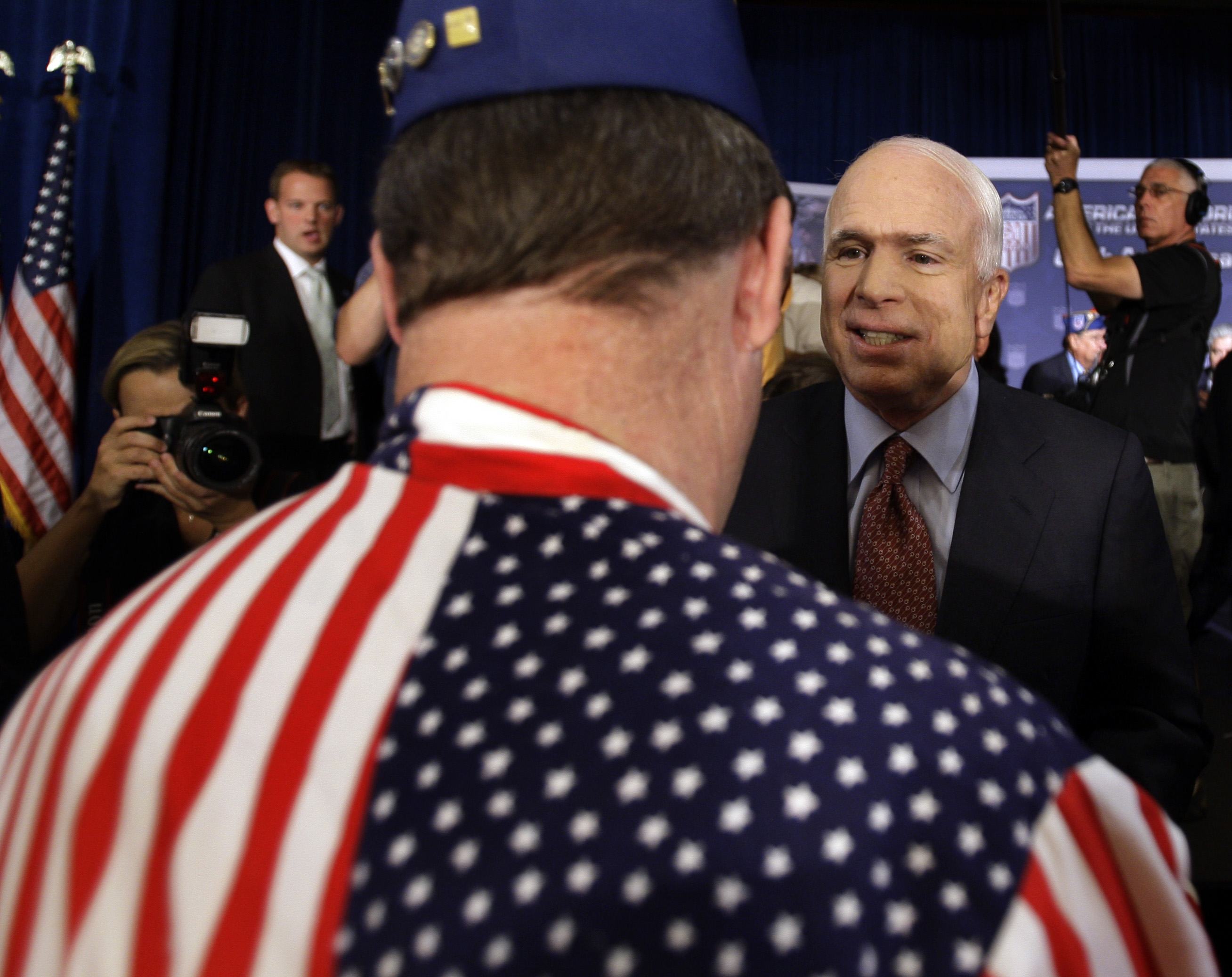 McCain spoke in a Denver hotel banquet hall to supportive members of the GI Forum, who frequently interrupted his speech with cheers and gave him a standing ovation.