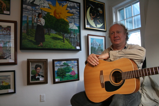 Photo 6: Muralist Tom Quinn showed off his other talents during the sale—his guitar and vocal skills. With his paintings as a backdrop, Quinn sang and strummed a lovely rendition of Leonard Cohen’s “Hallelujah.”
