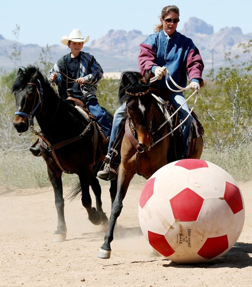 Jacob and Monika Snyder herd the ball towards a goal during a demonstration of “horse soccer” at Horsenut Stables in Golden Valley, Ariz., on Saturday. You write the cutline. (AP Photo/Kingman Daily Miner, JC Amberlyn)