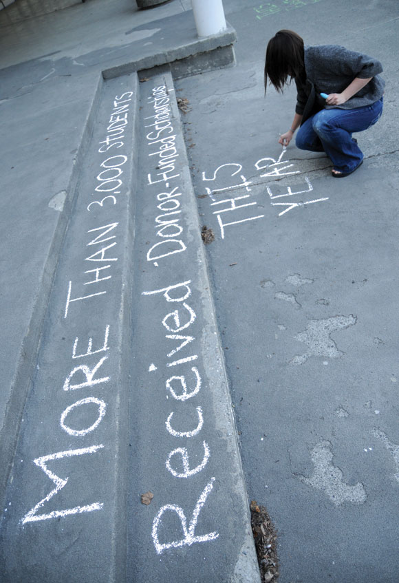 Alexis Olson, an English, political science, and international studies major with a Spanish minor, “tags” steps out front of the Student Union Building Thursday afternoon. Tag Day is designed to raise student awareness about the monetary impact donors have. Story here . Nick Groff/Argonaut