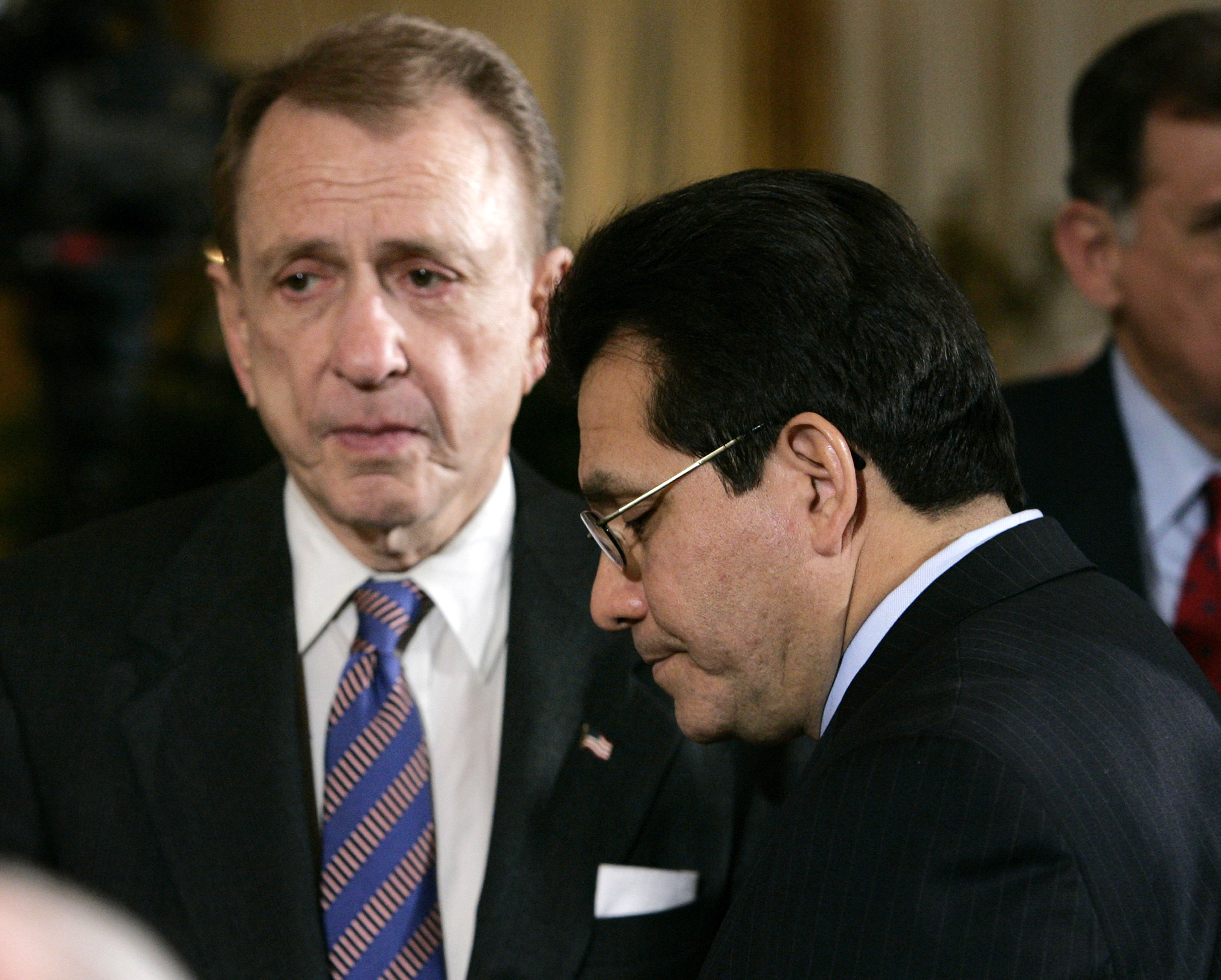 In this Wednesday, Feb. 1, 2006 file photo, Attorney General Alberto Gonzales, right, speaks with Sen. Arlen Specter, R-Pa., chairman of the Senate Judiciary Committee, before the start of a ceremony in the East Room of the White House in Washington. Several officials on Tuesday said veteran Sen. Specter intends to switch parties, advancing his own hopes of winning a new term next year while pushing Democrats one step closer to a 60-vote filibuster-resistant majority. Story here . (AP Photo/Charles Dharapak)