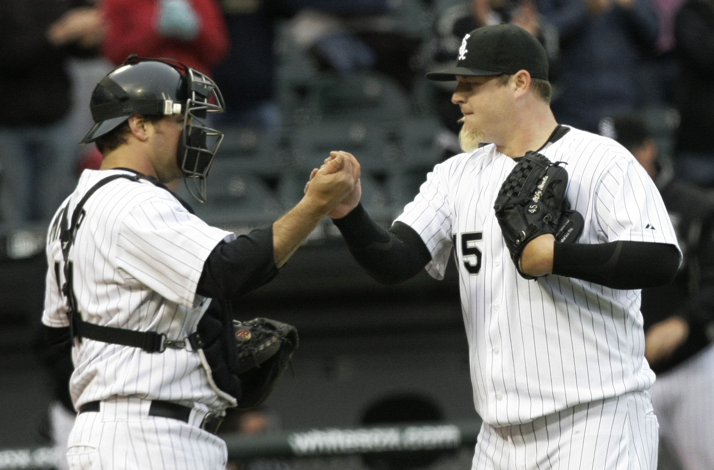 Chicago White Sox catcher Corky Miller, left, congratulates relief pitcher Bobby Jenks after their 2-1 win against the Seattle Mariners in the first game of a baseball doubleheader in Chicago this afternoon. Jenks is a former Spirit Lake area ballplayer. The White Sox and M’s are now playing the second game of the twinbill. The Mariners, behind Felix Hernandez, are leading 4-0 in the third inning of the second game here . (AP Photo/Charles Rex Arbogast)
