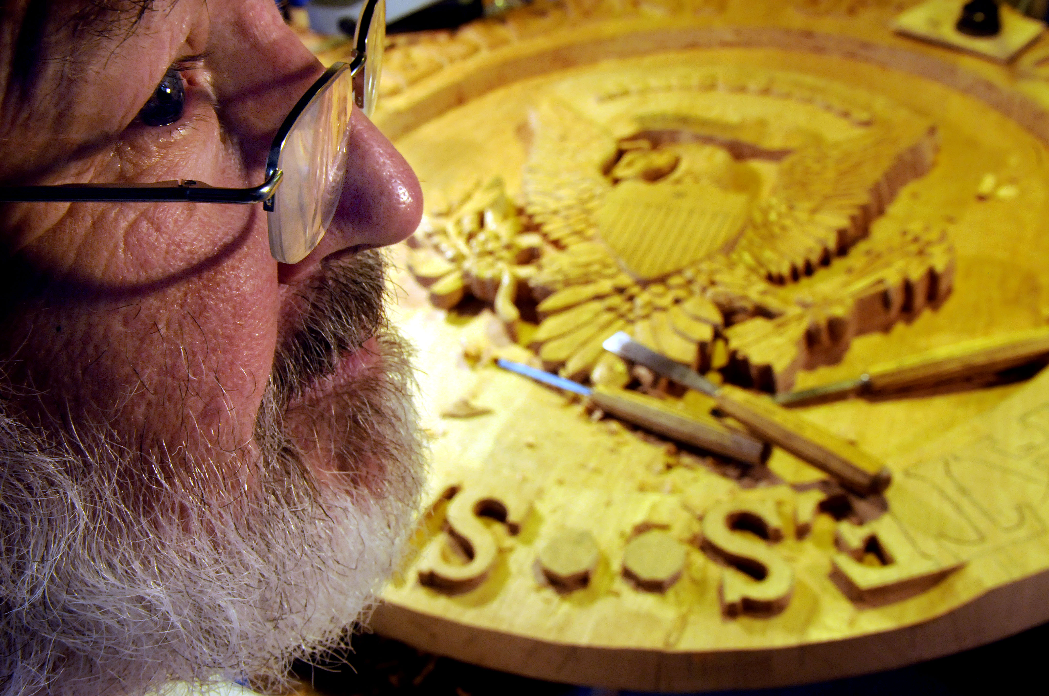 Woodworker Bruce Wright, of Rathdrum, is creating carving of the presidential seal that he intends to give to President Obama. Jacob Livingston story here . (Kathy Plonka/SR)
