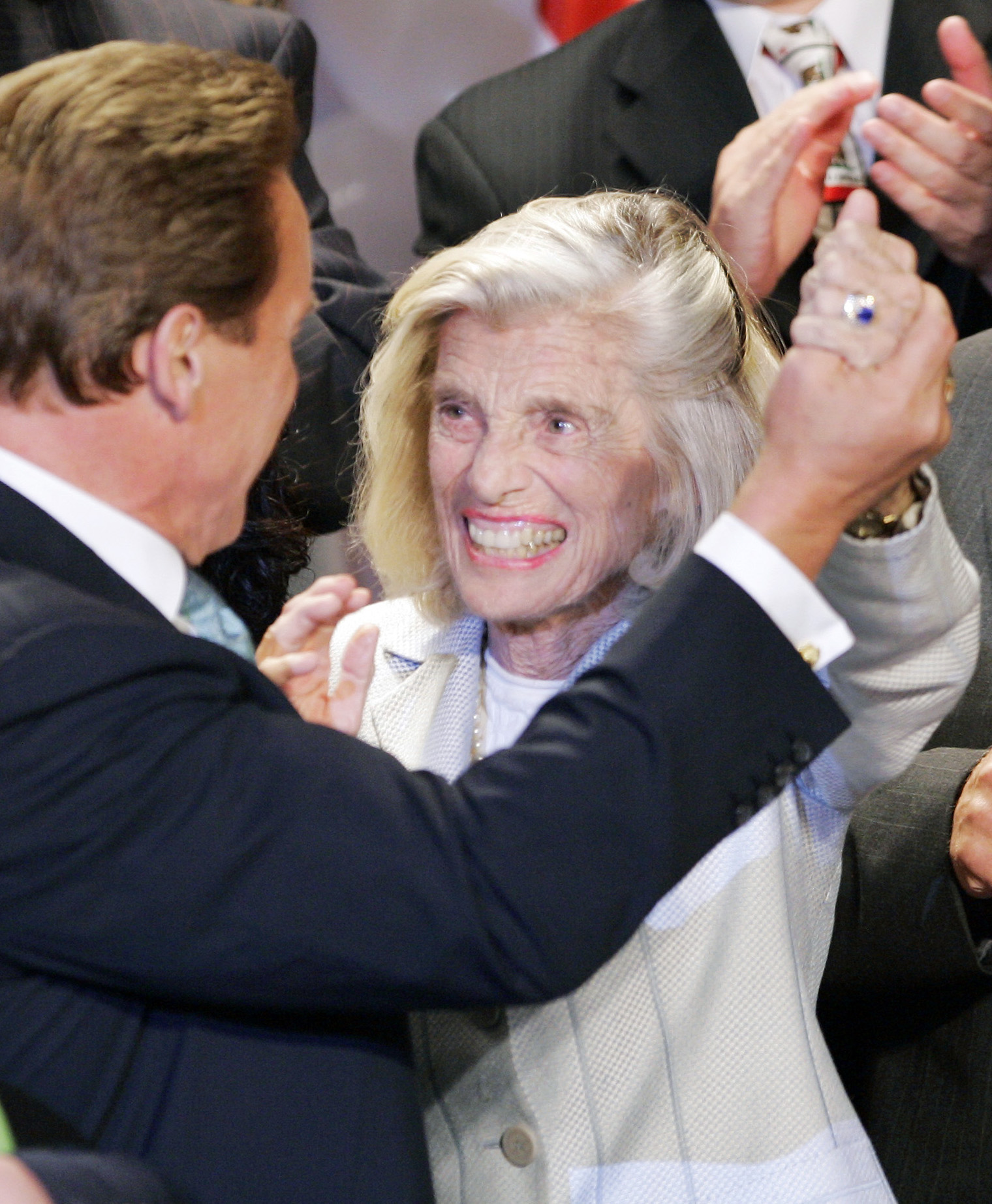 In this Nov. 7, 2006, file photo, Gov. Arnold Schwarzenegger dances with his mother-in-law Eunice Kennedy Shriver after giving his acceptance speech, Tuesday, in Beverly Hills, Calif. Shriver, JFK’s sister and Special Olympics founder, has died at age 88. Story here . (AP Photo/Mark J. Terrill, File)