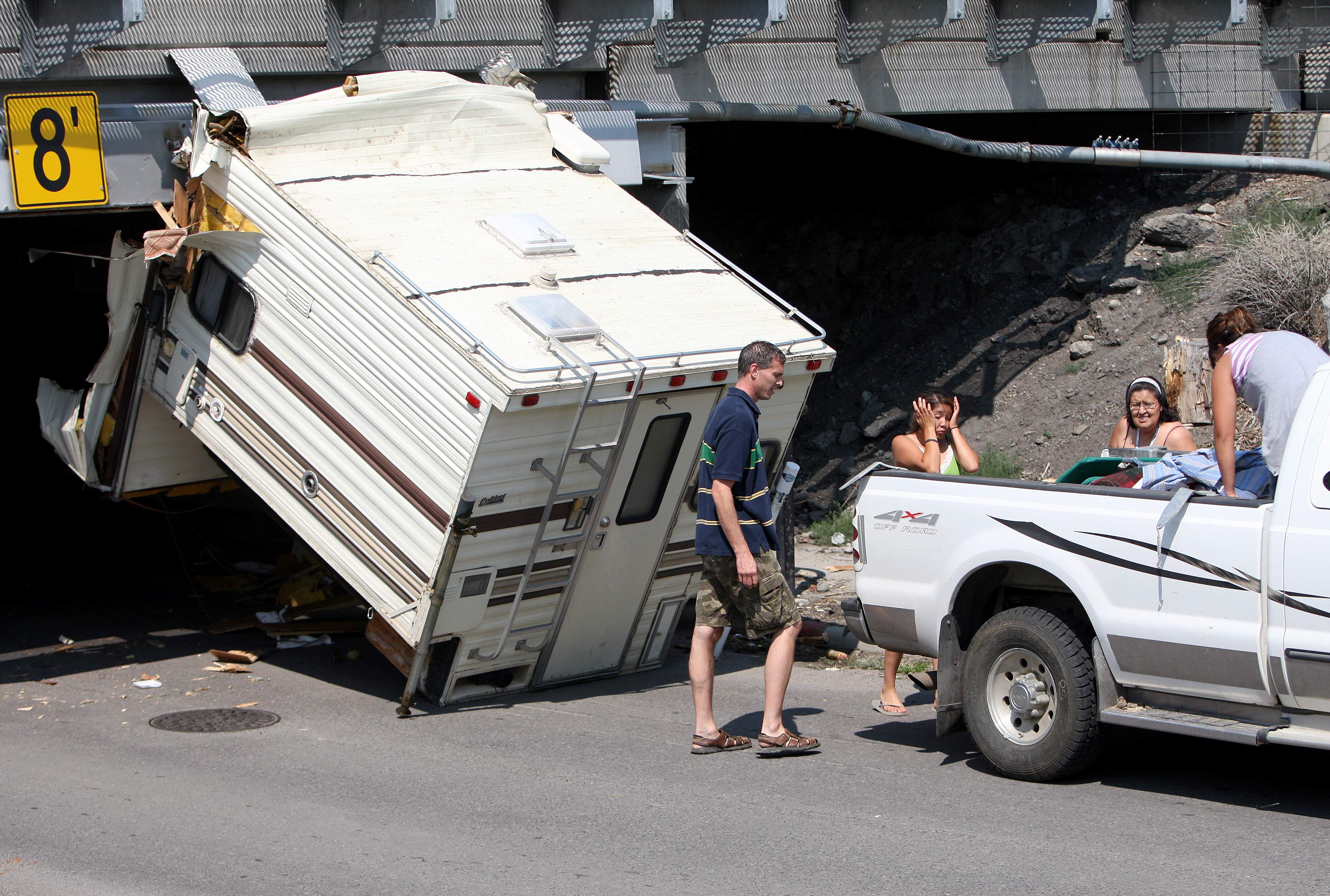 A family from North Dakota loads their belongings into their truck after their camper was sheared off by the railroad underpass on N. 21st Street between Montana Avenue and Minnesota Avenue in Billings, Mont., on Tuesday. No one was injured in the accident, and the driver, Leo Cummings of Newtown, N.D., was not issued any citations. (AP Photo/Billings Gazette, Casey Riffe)