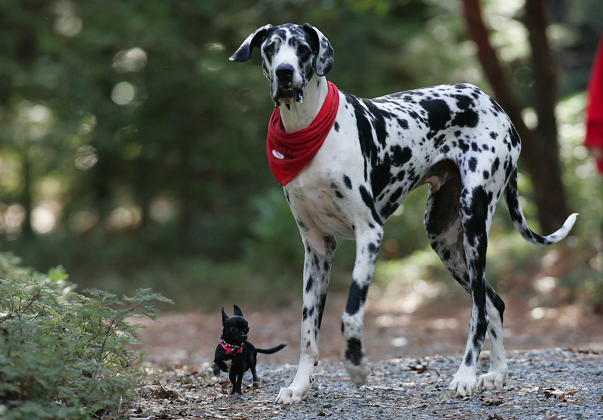 This undated handout photo provided by the journal Science shows Gibson, a Great Dane, right, and Zoie, a Chihuahua in Grass Valley, Calif. Gibson, the California dog dubbed the tallest in the world by the Guinness Book of World Records, died last Friday after a battle with bone cancer. The 7-year-old harlequin Great Dane from Grass Valley measured 7 feet, 1 inch when standing on its hinds legs. He was diagnosed with the disease in April 2009 and had his front right leg amputated to prevent its spread. He also underwent chemotherapy as a precaution. (AP Photo/Science, Deanne Fitzmaurice)