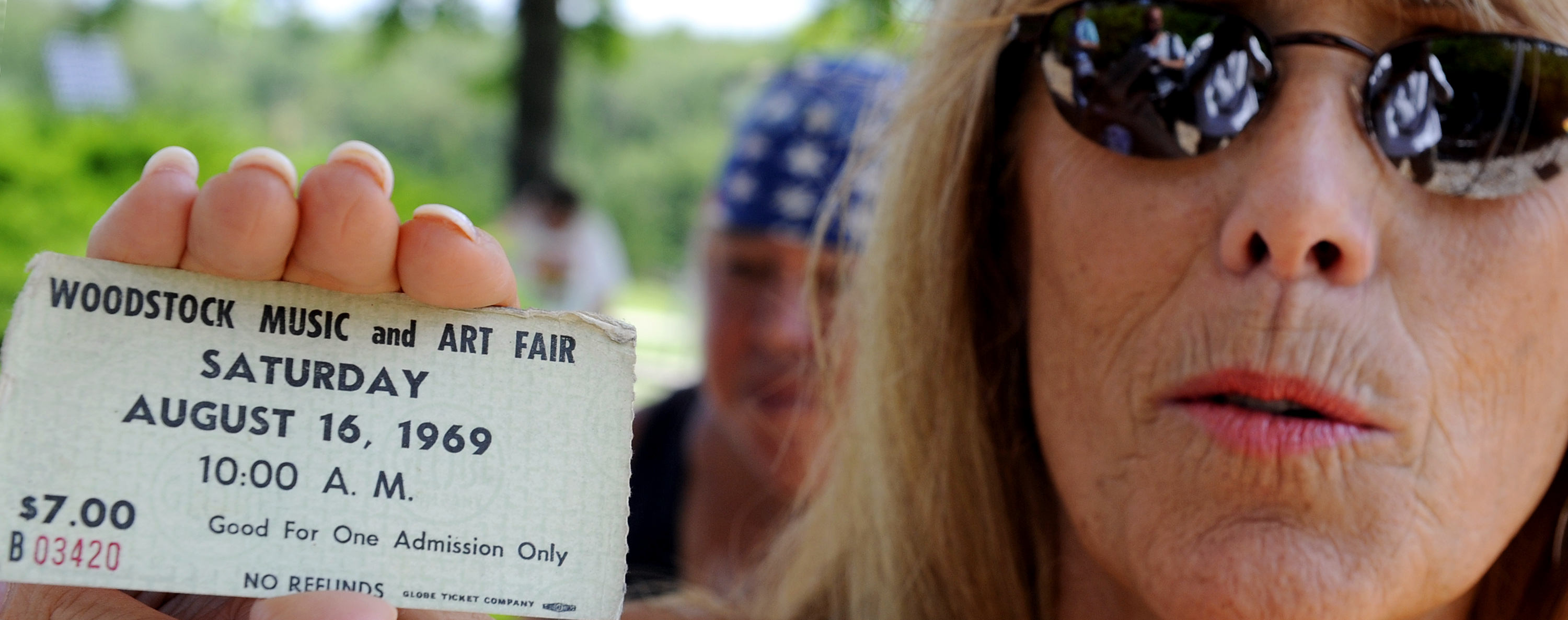Janet Huey holds her original 1969 Woodstock Festival ticket during her visit to the Woodstock site today in Bethel New York. A concert at Bethel Woods on Saturday will commemorate the 40th anniversary. (AP Photo/Stephen Chernin)