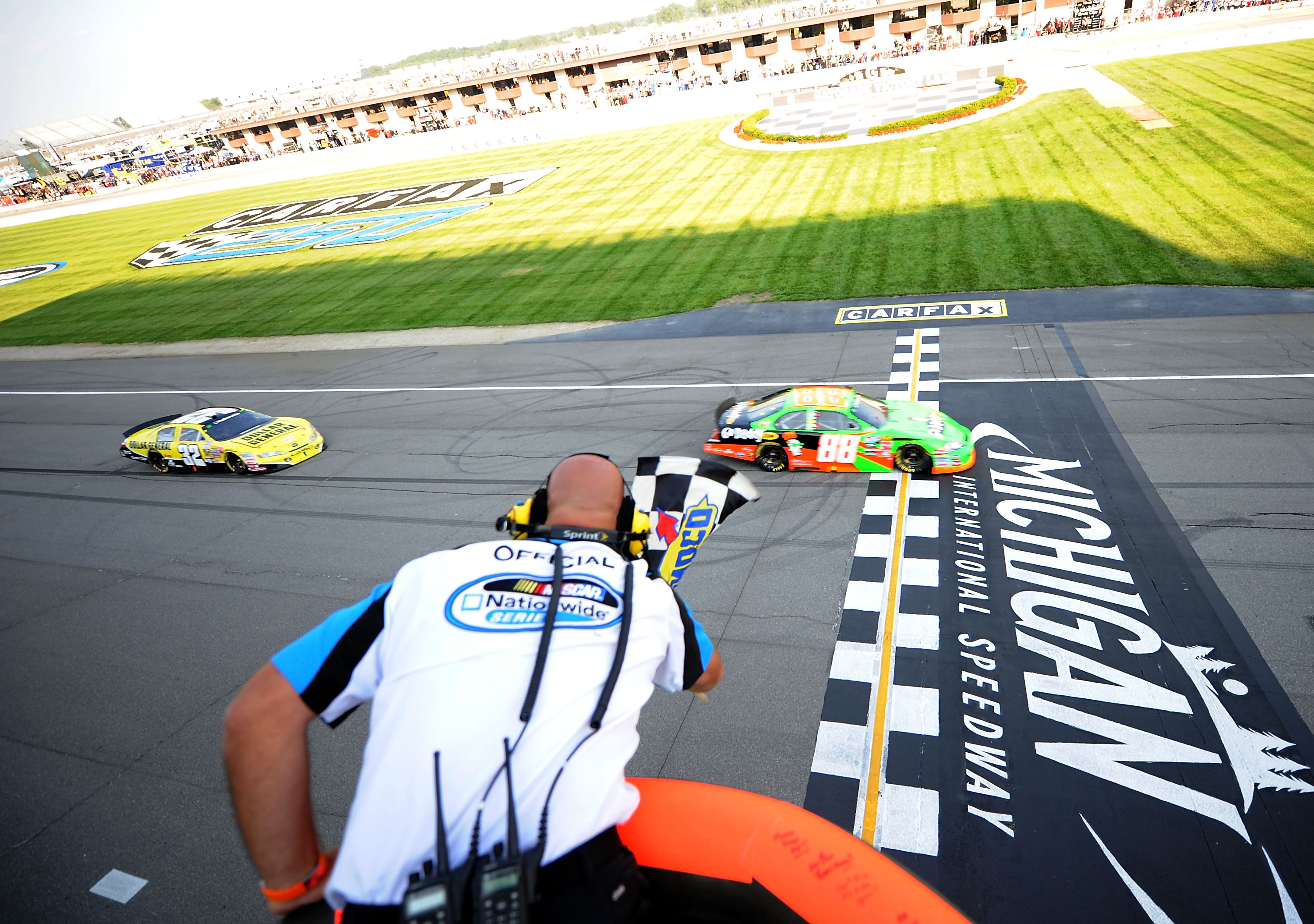 Edwards fought to regain control, but the cars touched again and Edwards slammed nose-first into the outside wall. The impact eliminated the No. 60 Ford from the race — the first time Edwards has failed to finish a NASCAR Nationwide Series event since May 2008 at Darlington.
