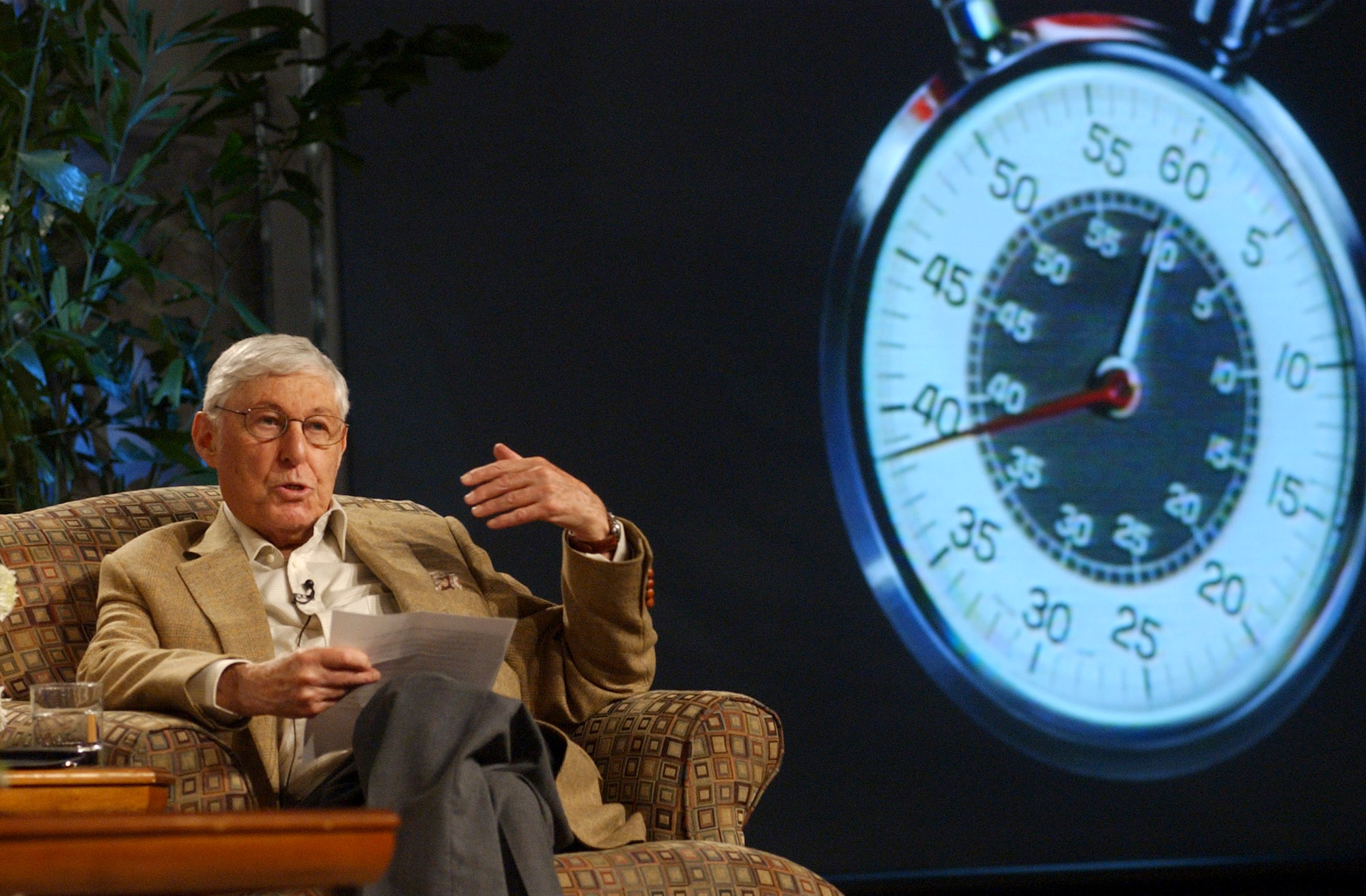 In this Jan. 17, 2004, file photo, against a backdrop of the famous “60 Minutes” stop watch, Don Hewitt, the program’s creator and executive producer, reads prepared remarks to reporters during a session on “60 Minutes” during CBS’ Winter Press Tour in the Hollywood section of Los Angeles. Hewitt, 86, the newsman who invented “60 Minutes” and produced the popular newsmagazine for 36 years, died, according to CBS. Story here . (AP Photo/Rene Macura, file)
