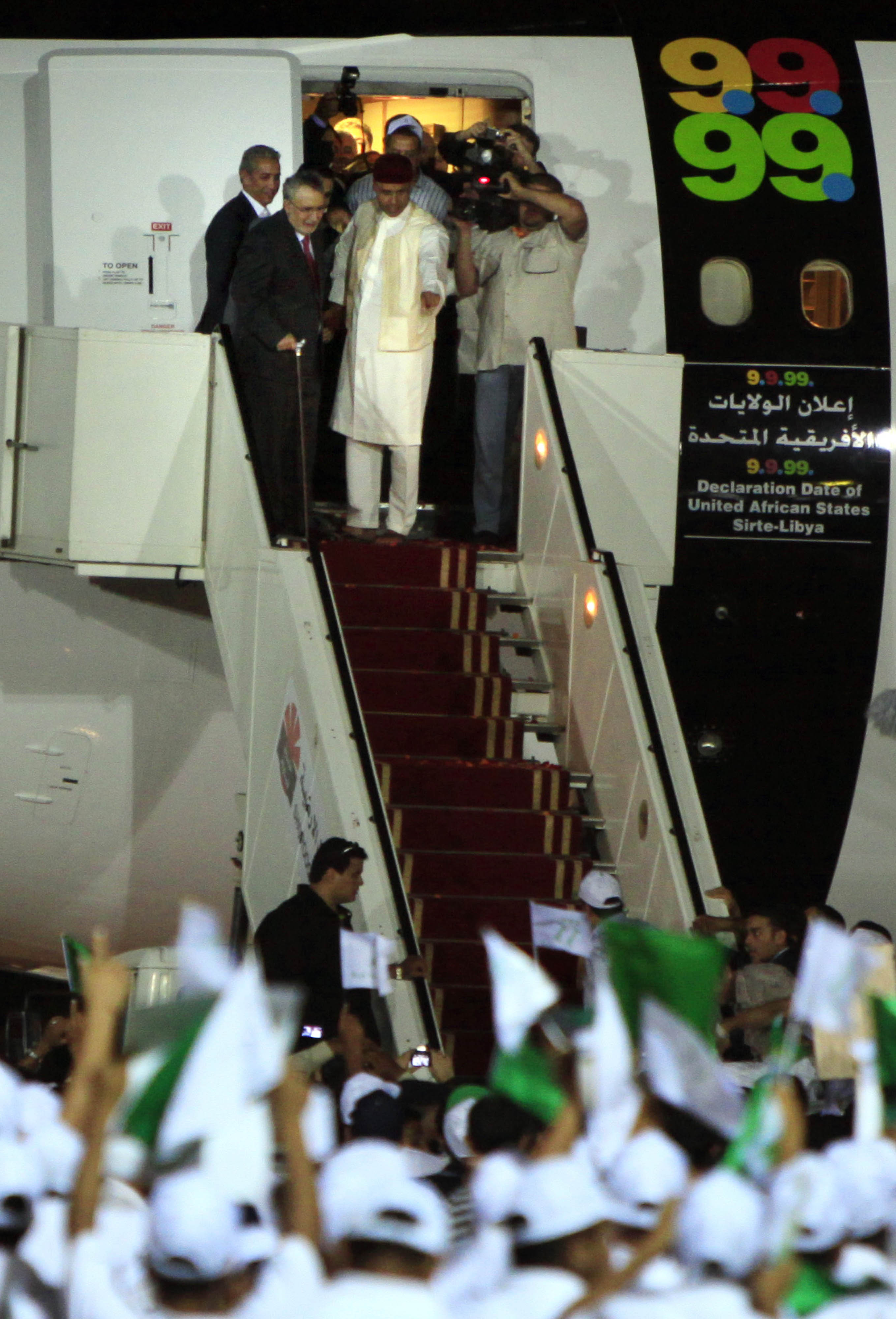 Libyan Abdel Baset al-Megrahi, top, left, using stick, who was found guilty of the 1988 Lockerbie bombing, is accompanied by Seif al-Islam el- Gadhafi, son of Libyan leader Libyan leader Moammar Gadhafi upon his arrival at an airport in Tripoli, Libya, Thursday. Scotland freed the terminally ill Lockerbie bomber on compassionate grounds Thursday, allowing him to die at home in Libya despite American protests that mercy should not be shown to the man responsible for the deaths of 270 people. Story here . (AP Photo/ Amr Nabil)