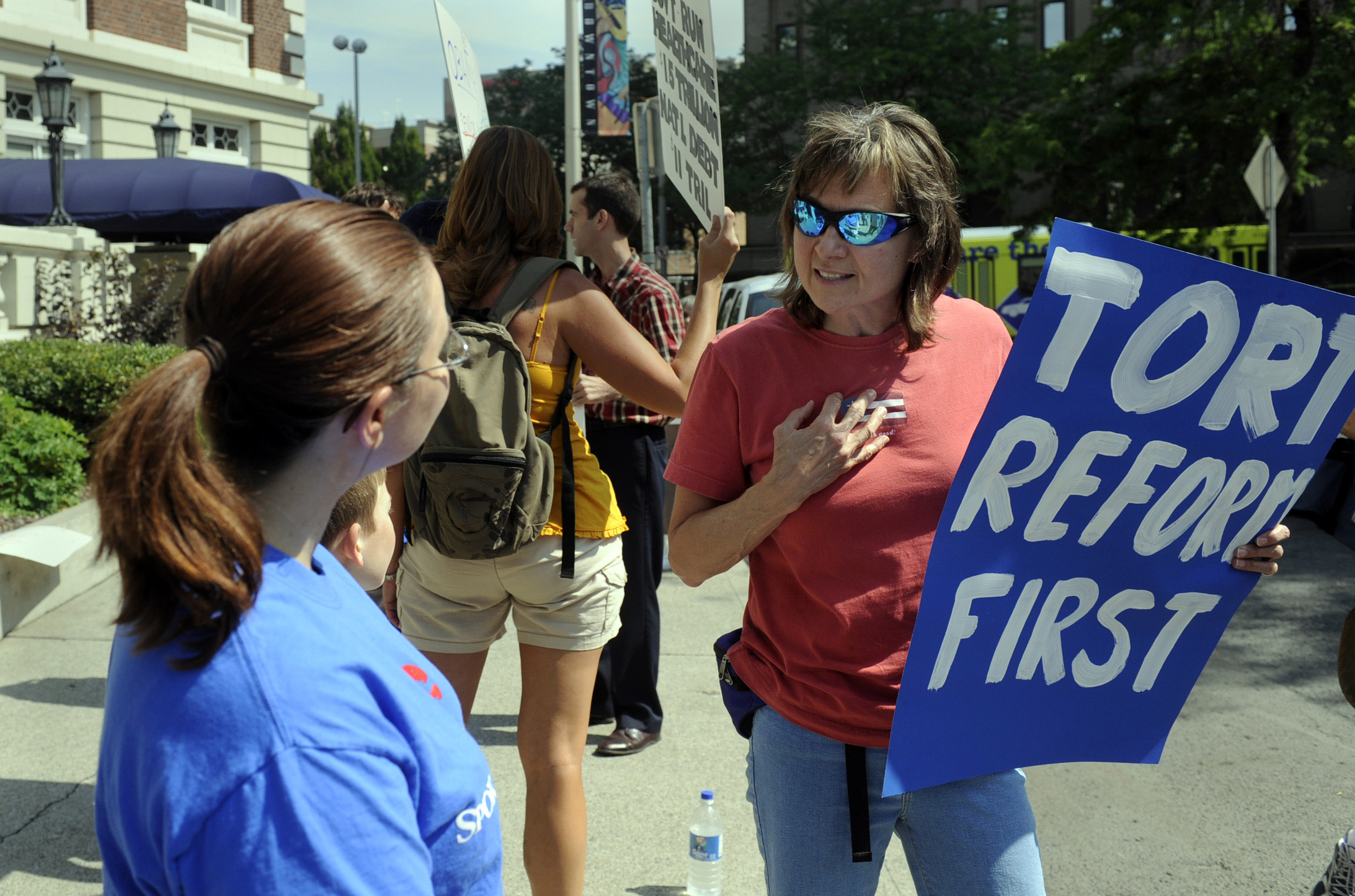 Krista Woodruff, right, a retired nurse and wife of a doctor, debates the proposed federal health care plan with Amy Biviano, left, the chair of the Spokane County Democrats outside the Spokane Club, where Sen. Patty Murray, D-Wash., was speaking to a Rotary Club group about issues including health care, Thursday in Spokane. Story here . (AP Photo/The Spokesman-Review, Jesse Tinsley)