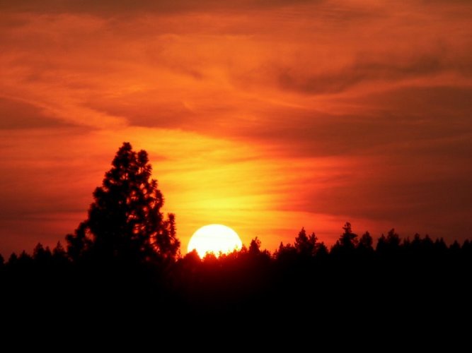 “Early in the week,” e-mails Don Sausser, “a smoke-doused sky caused old sol to create a sunset where it otherwise couldn’t. Within only one more minute it’s 95 degree rays would be extinguished to provide Coeurd’aleniens a delightful amenity, cool summer nights for comfortable sleeping.”
