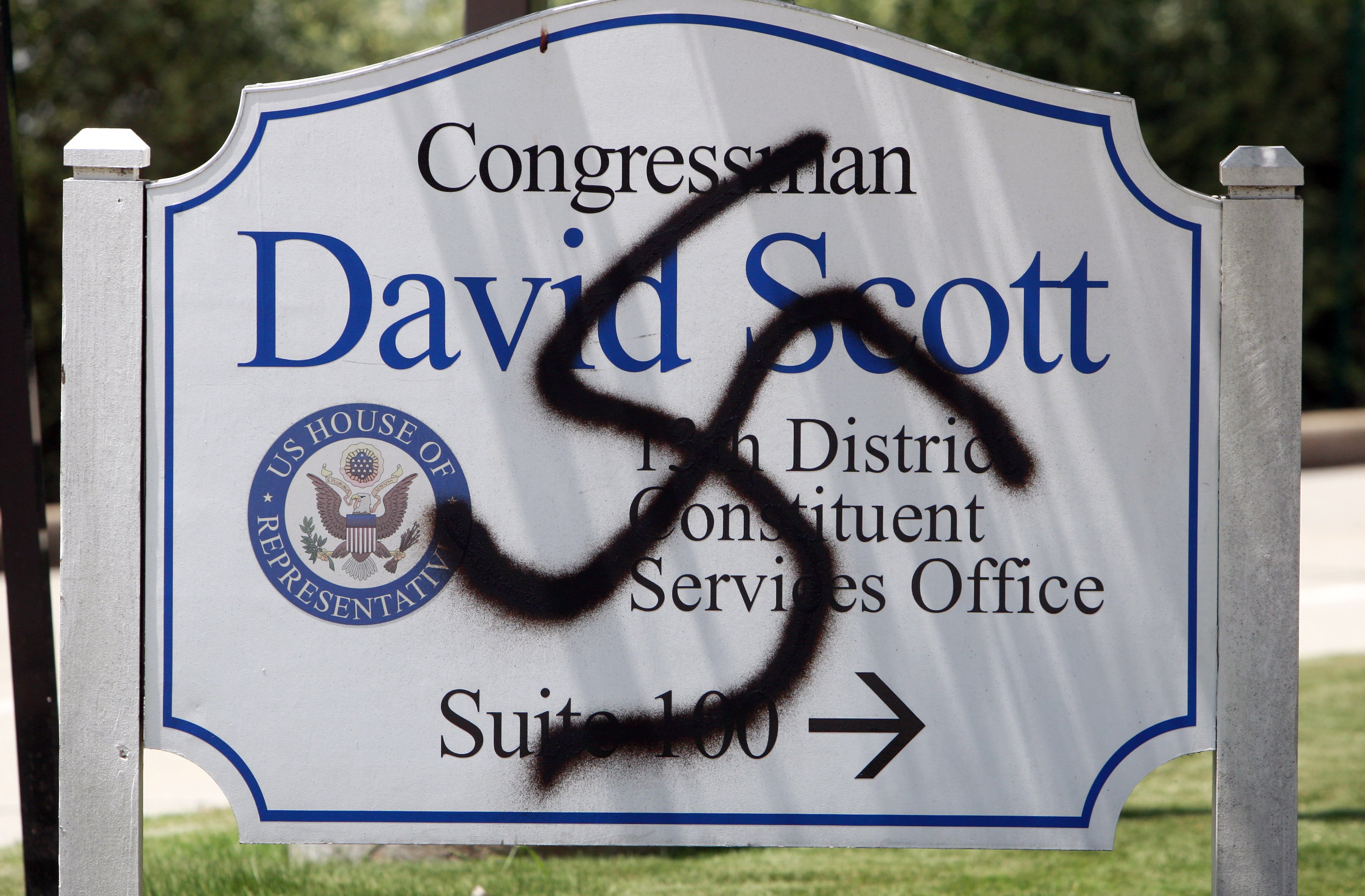 A vandalized sign outside the office of Rep. David Scott, D-Ga., is shown earlier this month in Smyrna, Ga. Scott had a contentious community meeting on health care last week. Scott, who is black, said the swastika is the latest example of what he believes is an increasingly hateful and racist debate over reforming health care. The Atlanta lawmaker said he also has received mail in recent days that used N-word references to him, and that characterized President Barack Obama as a Marxist. (AP Photo/John Bazemore)