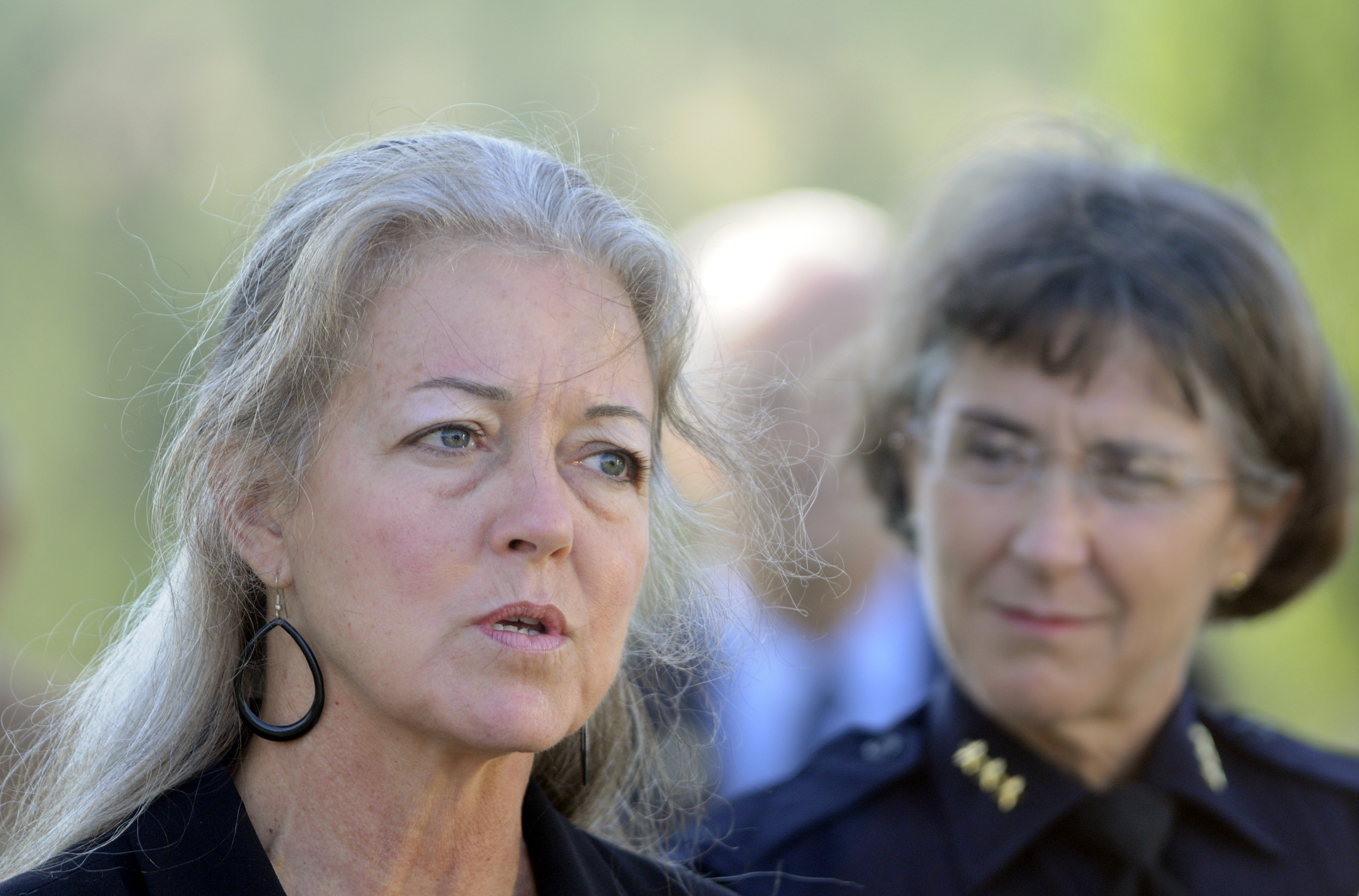 In this Spokesman-Review picture Spokane Mayor Mary Verner in front of Police Chief Anne Kirkpatrick speaks against racist propaganda at a news conference Friday, Aug. 21, 2009, near the state line.