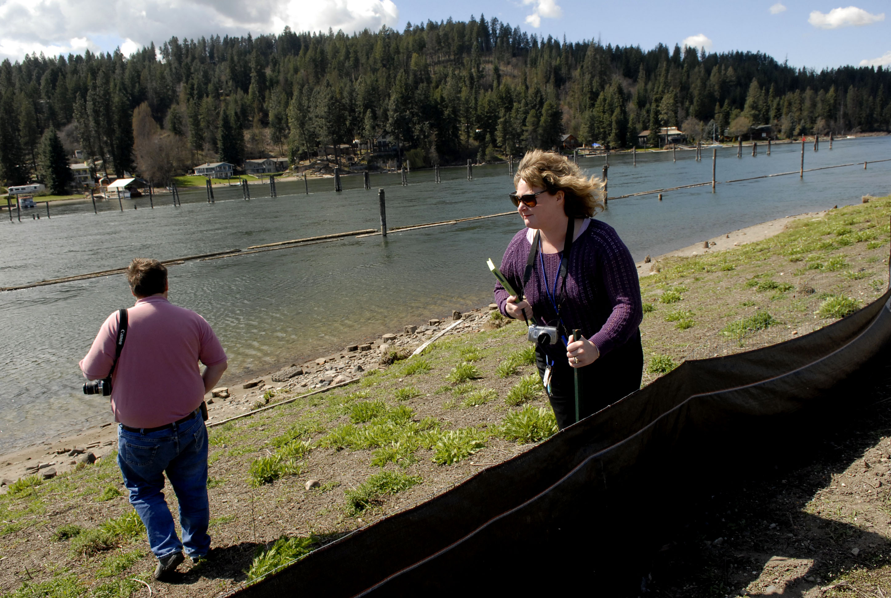 After a few calls to the media, a meeting was set up this afternoon with the local U.S. Army Corps of Engineers representative. Environmental Resource Specialist/Biologist Beth Reinhart met Gookin along with Duane Rasmussen, Matt Roetter and Ron Johnson in the Starbuck’s parking lot so she could investigate the alleged wrong-doing. A CdA Press reporter, who set up the meeting, also tagged along as did a Spokesman reporter and photographers from both papers. Gookin lead the group along the shoreline, where crews are building condos. Reinhart inspected the silt fences, the rock retaining walls, and the pilings for the public boardwalk and concluded that everying looked good. “This looks like a good job, a really good job,” Reinhart said. She politely answered the groups questions and said she would investigate to see who owned the property and if they had proper permits.