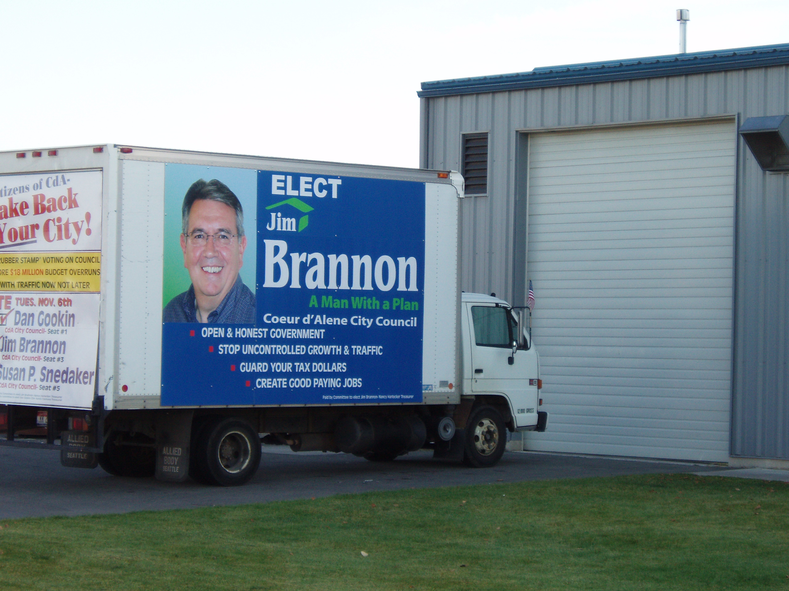 In the comments section today, there has been some discussion whether Coeur d’Alene City Council wannabe Jim Brannon is aligned with OpenCDA.com’s Dan Gookin. I have dug through my photo archives and discovered/remembered that they shared a rolling billboard in the past. The 2007 photo above is of a campaign truck parked at Mary Souza’s business behind the charter school, taken during the last city elections. Of course, this doesn’t mean Brannon and Gookin are aligned now.