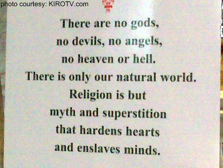 The picture of this sign is real. Although we still have a Christmas Tree slated for the Capital Building in Olympia, Washington, the Nativity Scene which had been there on display for years is now gone, verboten, forbidden. Instead we have a Christmas Tree and the sign in the picture, brought to you by the Atheists. I agree they have the right to have such a detestable sign present in our State Capital Building, but I have the same Constitutional Right to have a creche, a humble manger scene, as my personal celebration of Christmas present in the Capital Building. I have rights, too, dammit!/ David Laird , Community Comment. More here .