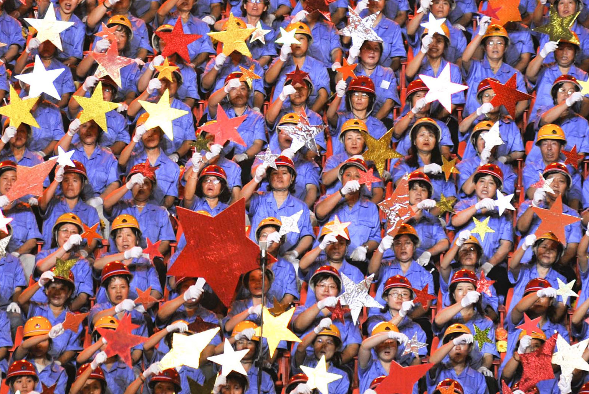 Participants perform a patriotic song in Beijing, China. A large-scale vocal concert featuring patriotic songs was held on Wednesday with the attendance of representatives from all walks of life in Beijing, Xinhua reported. You write the cutline. (AP Photo/Xinhua, Xie Huanchi)