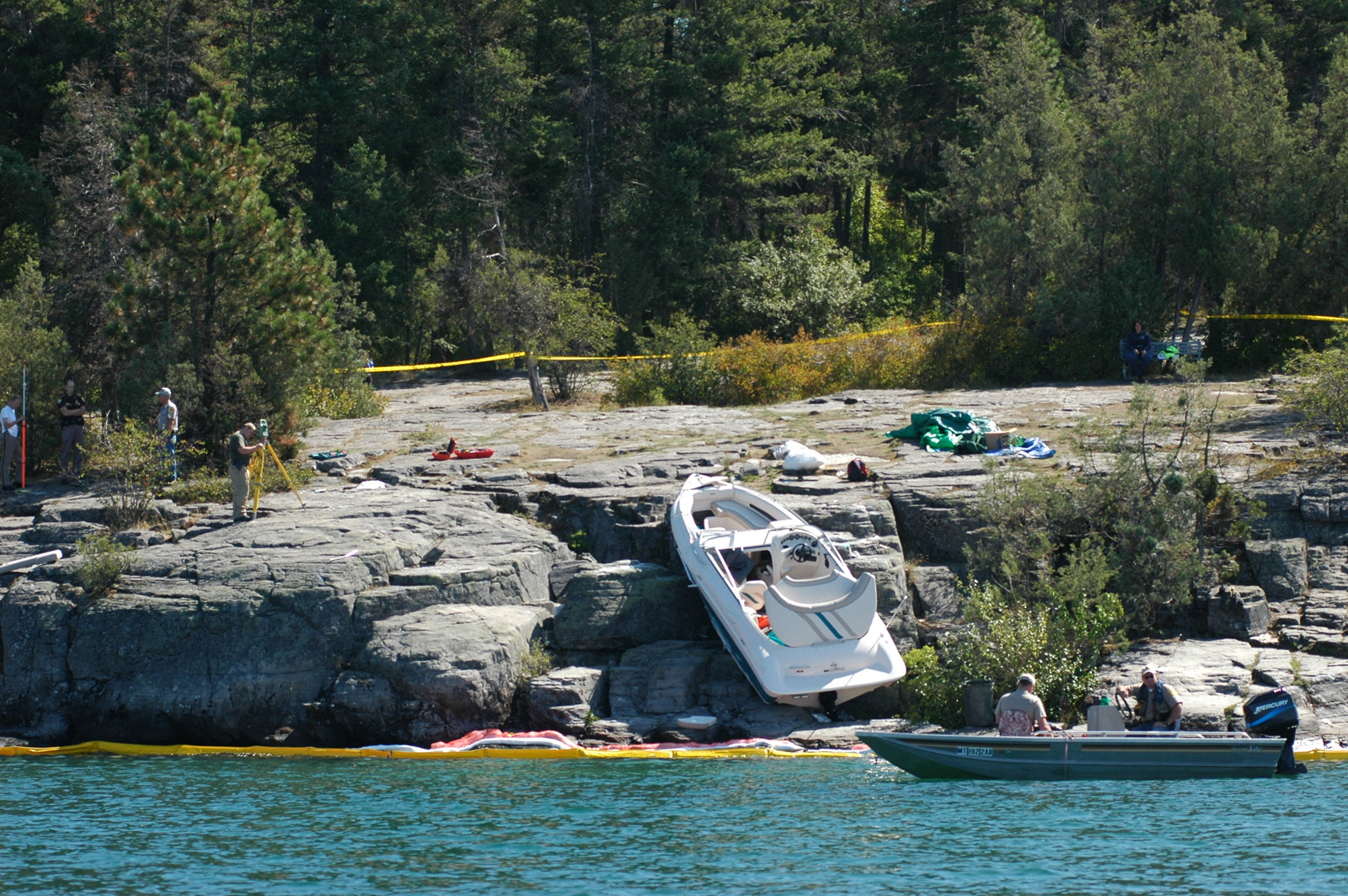 Authorities investigate near the scene of a boat crash in Bigfork, Mont., Thursday. U.S. Rep. Denny Rehberg, R-Mont., and four other people were hospitalized in stable condition Friday after their 22-foot boat ran into rocks in the dark. Hospital President Velinda Stevens said she couldn’t say anything else about the incident and referred questions to Rehberg’s office, which said it was working on getting details before commenting. Story here . (AP Photo/Bigfork Eagle, Alex Strickland)