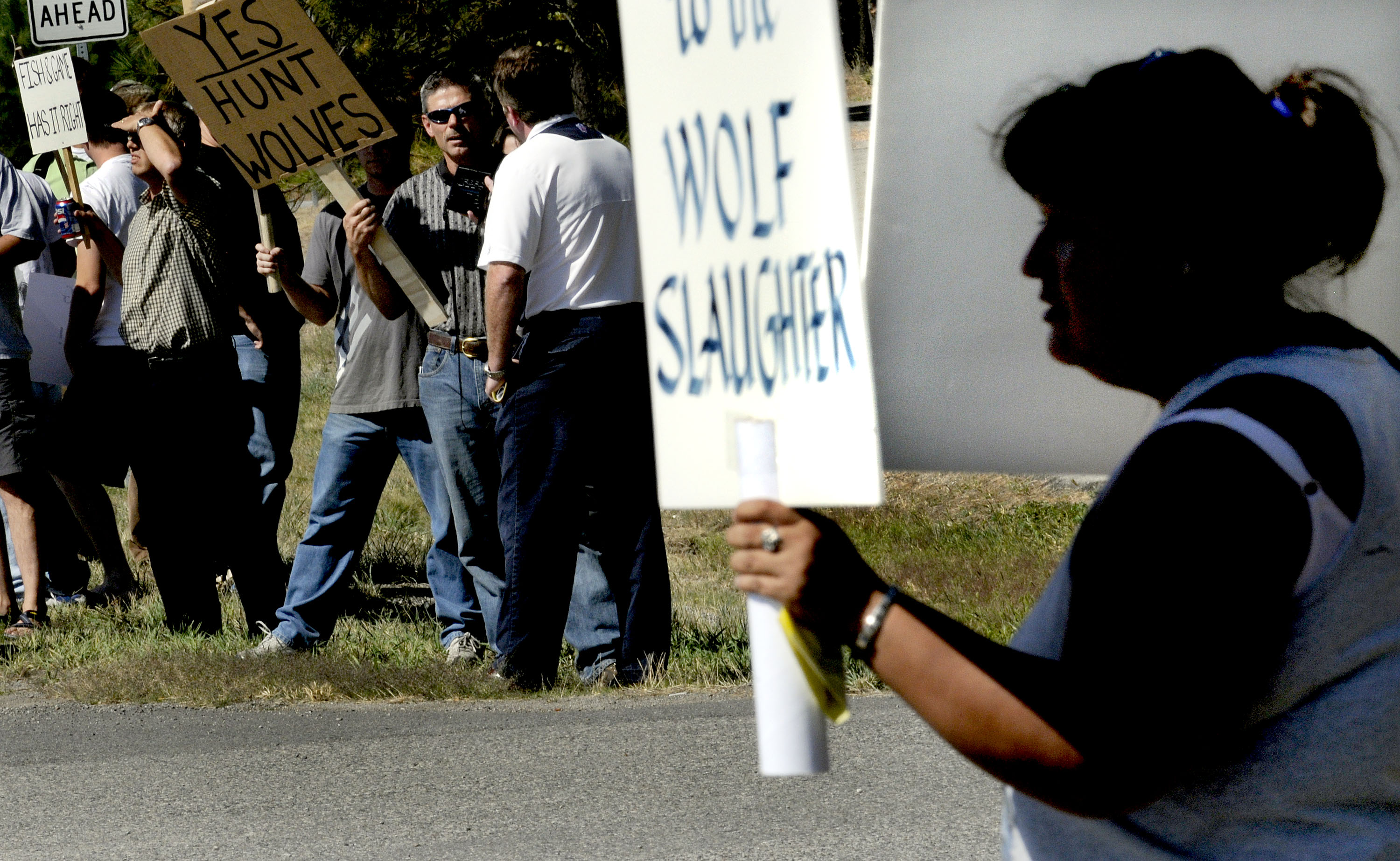 Members of the Sandpoint-based North Idaho Wolf Alliance turned out at the Coeur d’Alene Fish and Game office Friday morning to protest the state’s first regulated wolf hunt. Alongside the protesters was a smaller group who came out to show their support of the upcoming hunts. Approximately 40 protestors gathered at the scene, while 15 wolf hunt supporters gathered. The rally, which began at 11 a.m., consisted mainly of protestors and supporters carrying signs/ KHQ . More here .