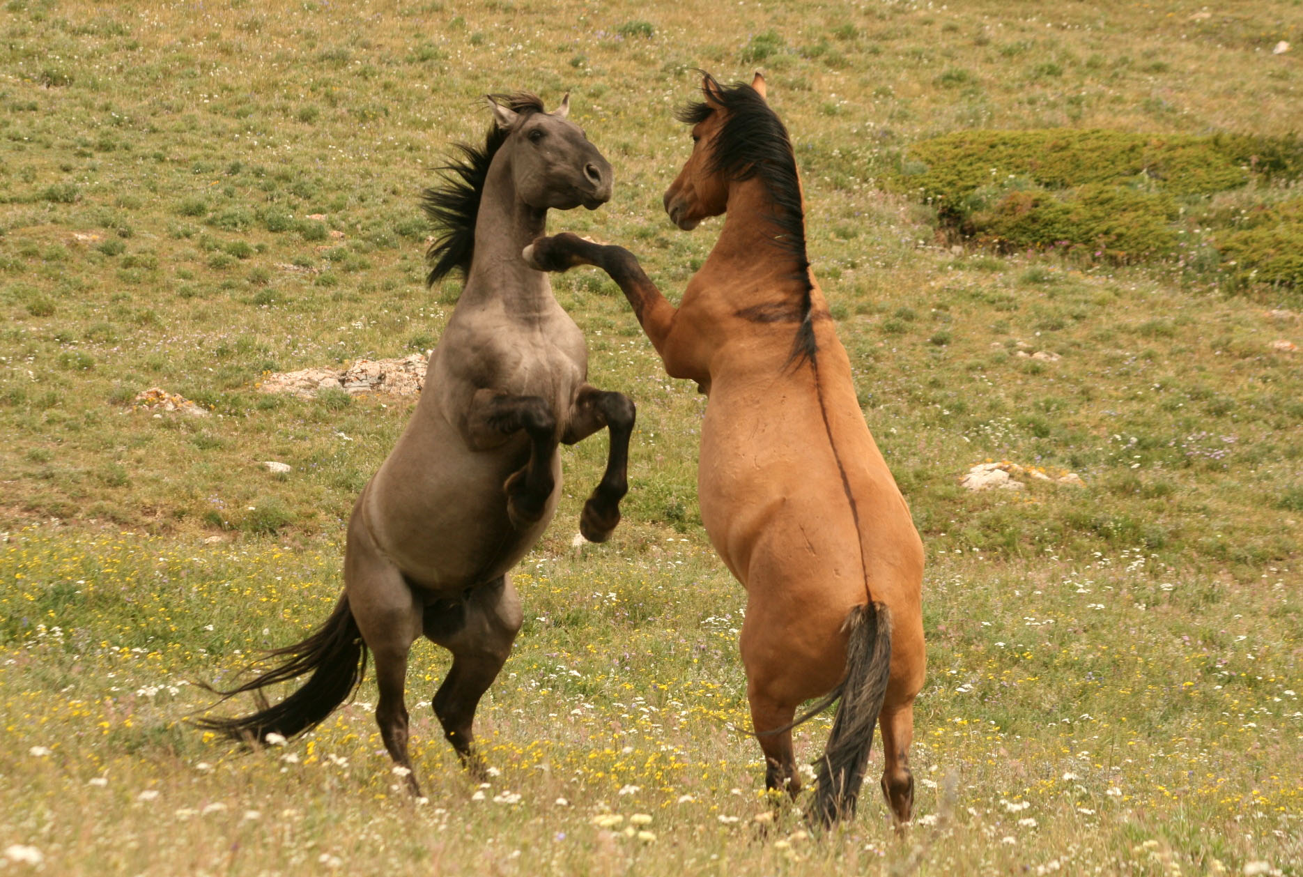 Two young stallions play together at the Pryor Mountain Wild Horse Range south of Billings, Mont. This week, federal officials had planned to thin by more than a third a wild horse herd that roams a mountain range along the Montana-Wyoming border. But the roundup that was suppose to begin today has been delayed until Thursday. Story here . (AP Photo/Pryor Mountain Wild Mustang Center, Matt Dillon)