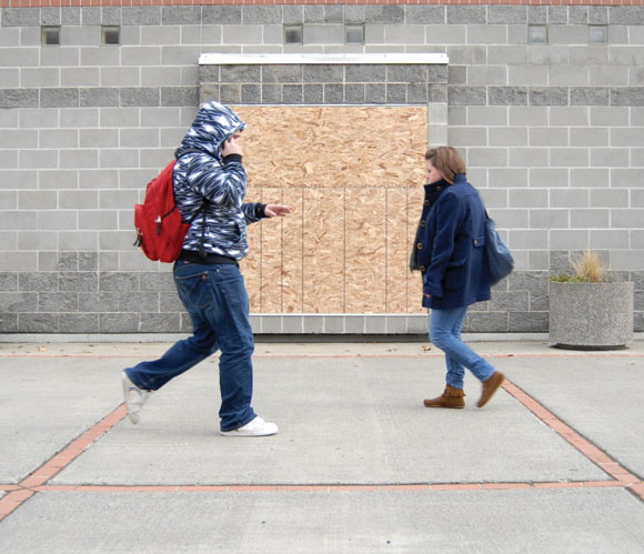 Students walk by the boarded-up windows of the University of Idaho Bookstore Monday. The bookstore was broken into Wednesday night and an undiclosed amount of electronics were stolen from the technology department. Moscow police are searching for two male suspects in the theft. Story here . (Jake Barber/Argonaut)
