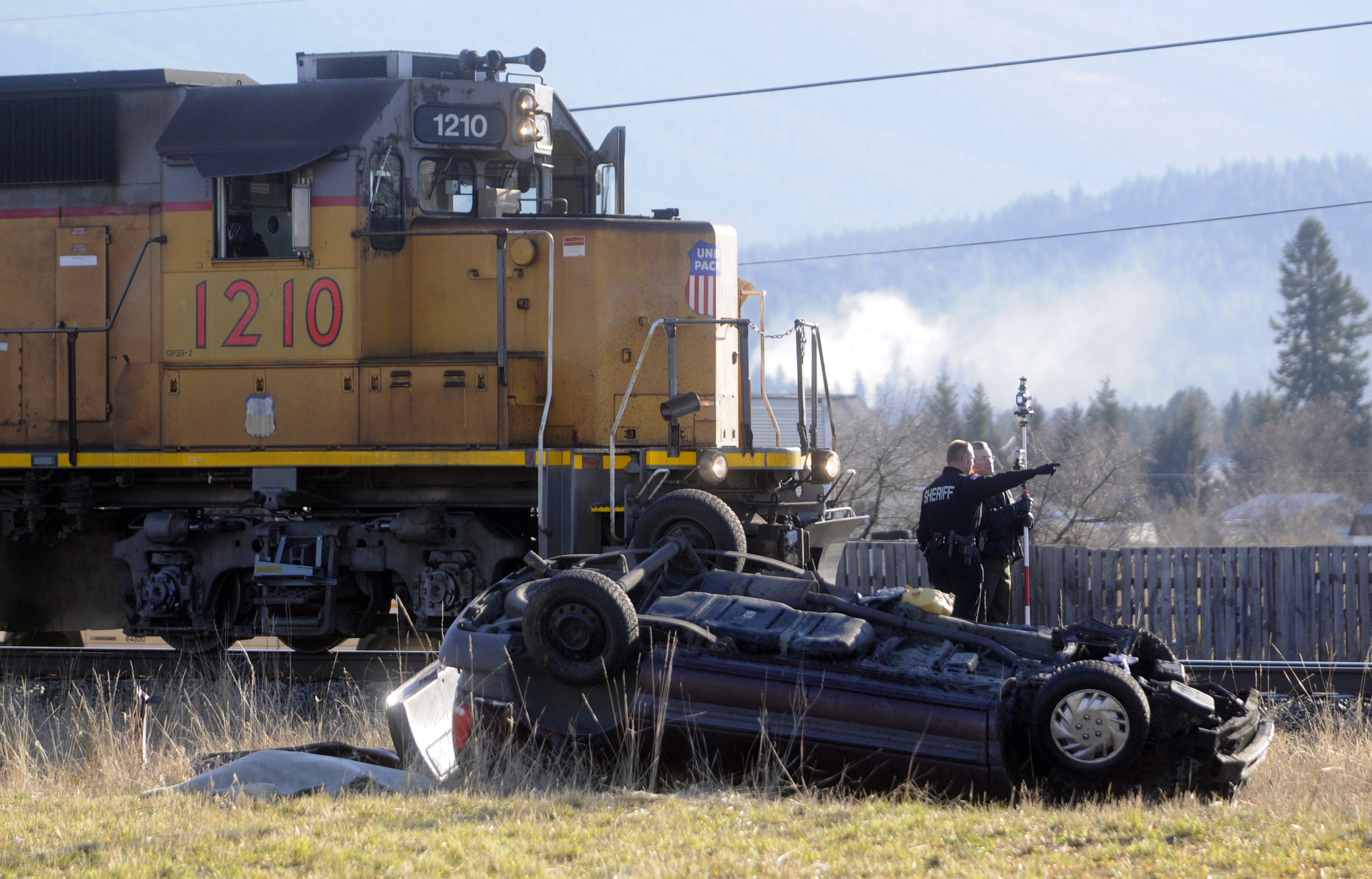 Investigators work at the site where a car was struck by a train on North Arden this morning. The woman had just dropped her 4-year-old son off at school in Spokane Valley. She was airlifted to the hospital. See story below. (J. Bart Rayniak/SR)