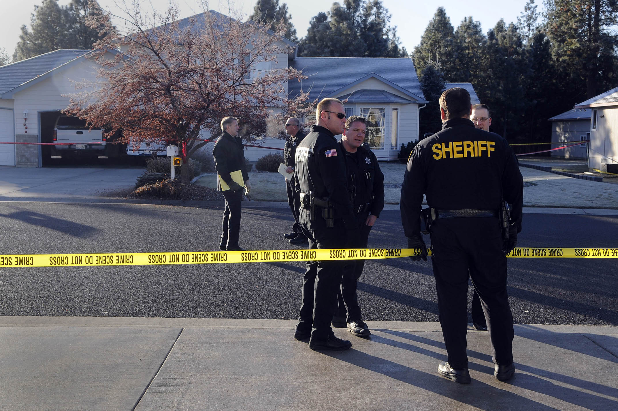 Deputies from the Spokane County Sheriff’s Office gather outside the the house at 4518 Woodglen to investigate a homicide this morning north of Mead in a development of upscale homes on the south side of Day-Mount Spokane Road. Story here . (Dan Pelle/SR)