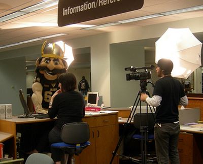 Joe Vandal is in the house … or he was in the house, the UIdaho library that is, Monday afternoon, according to JeanC’s Cat House & Shooting Gallery. Posts Jean, who caught the visit on film (above and here ): “The library is doing some instructional videos and got Joe Vandal to come and star in them.”