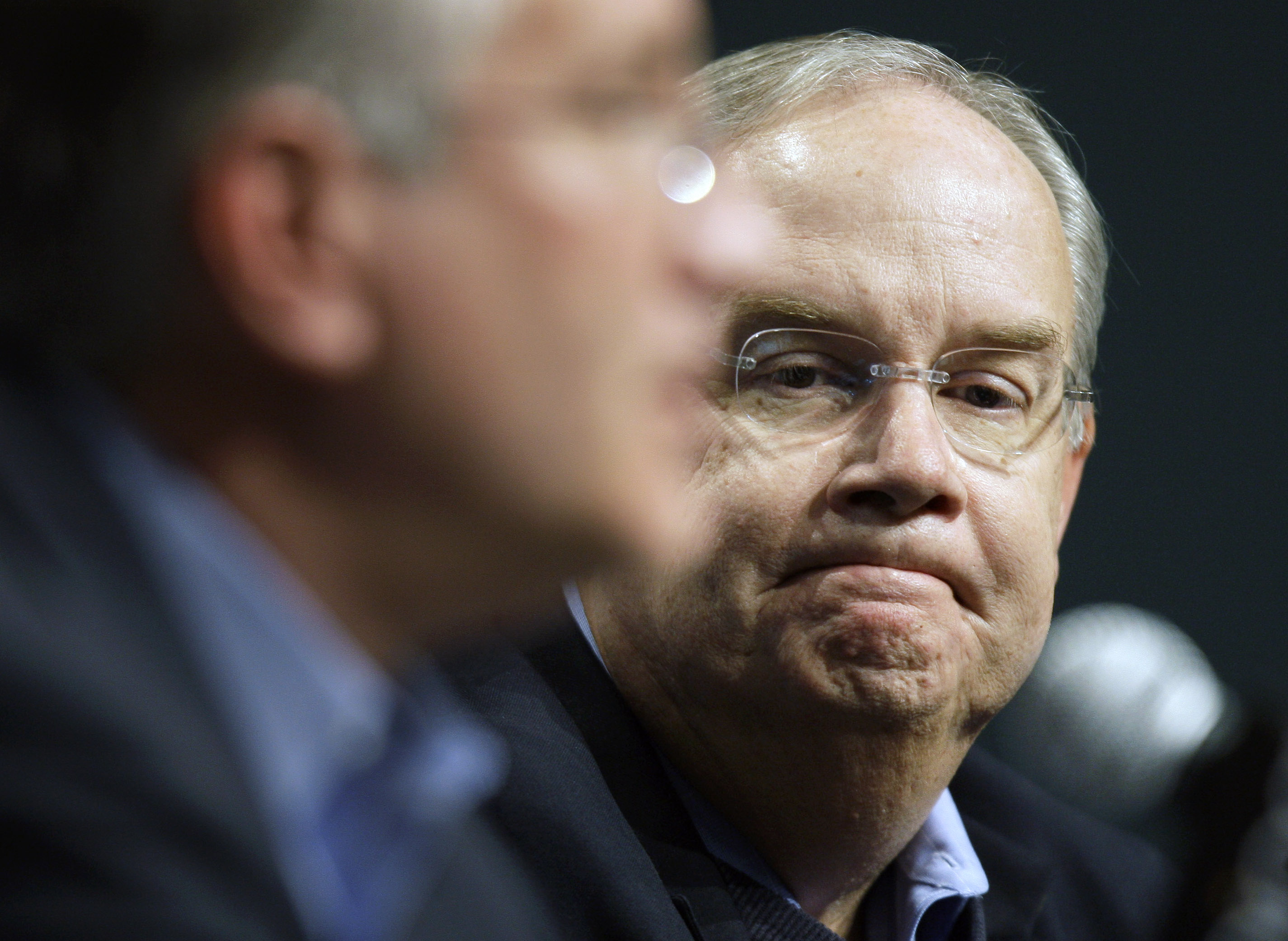Tim Ruskell, right, looks on as Tod Leiweke, left, CEO of the Seattle Seahawks, talks to reporters during a news conference announcing Ruskell’s resignation as general manager of the NFL football team on Thursday in Renton, Wash. Leiweke said that Seahawks vice president for player personnel Ruston Webster will serve as interim general manager. Story here . (AP Photo/Ted S. Warren)