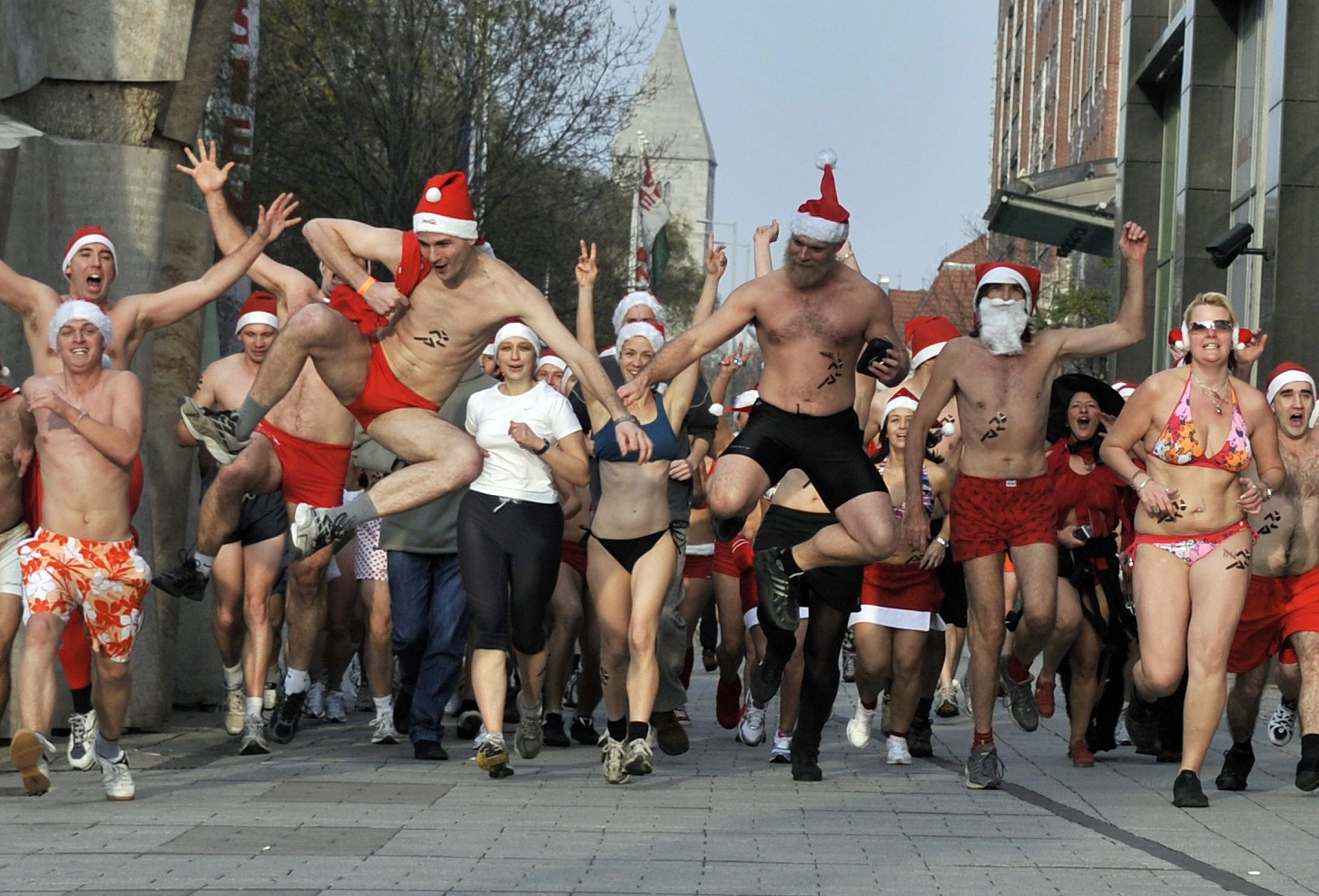 Hungarians attend a “Santa Claus Run” in downtown Budapest, Hungary, Sunday. Some hundred people ran together in their underwear, in temperatures around the freezing point during the annual charity run. You write the cutline. (AP Photo/Bela Szandelszky)