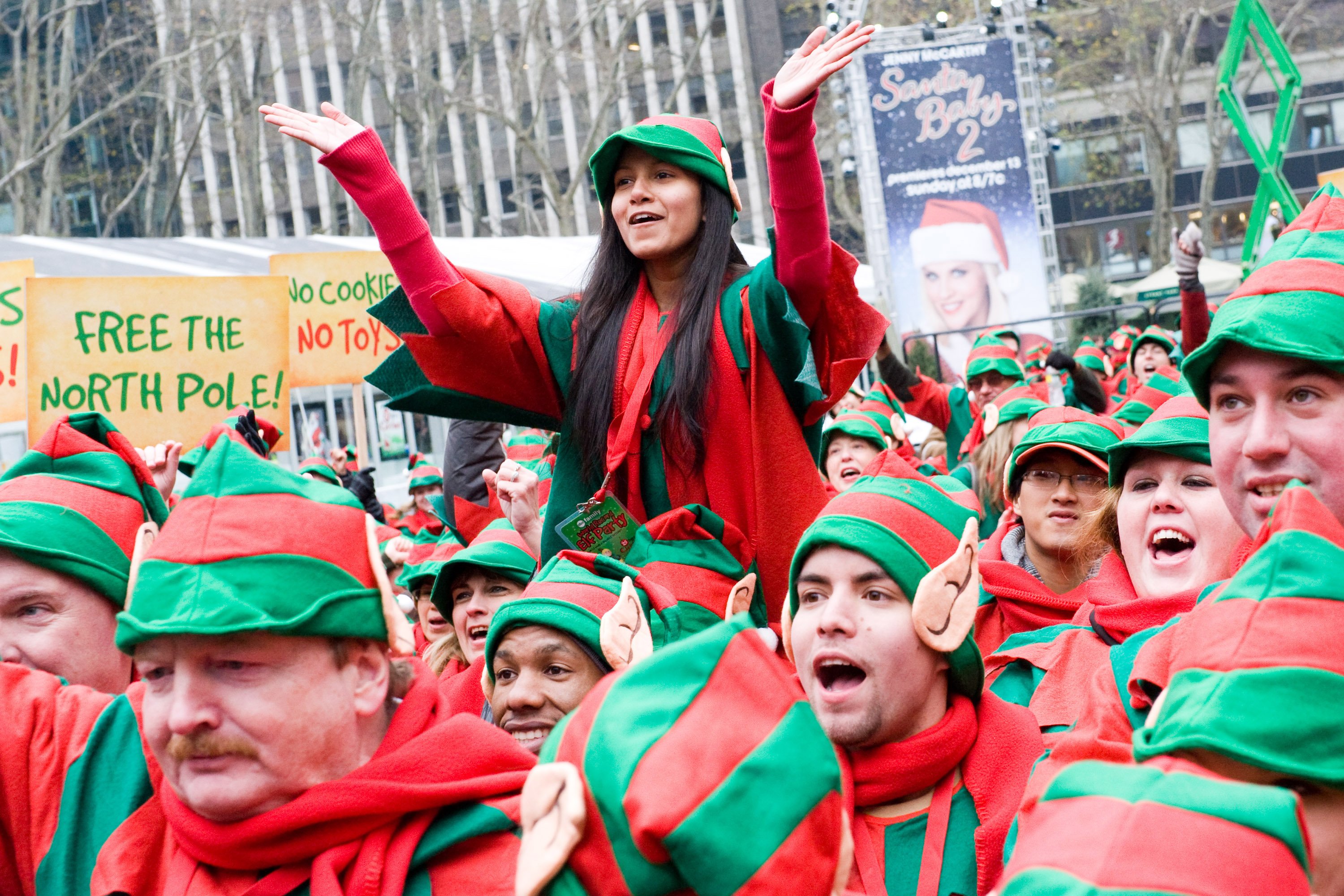 Attendees gather to attempt to break the Guinness World Record for the largest gathering of Santa’s Elves, in New York, Monday. You write the cutline. (AP Photo/Charles Sykes)