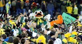 APhoto: Oregon Duck mascot hoisted by fans after win over Oregon State.