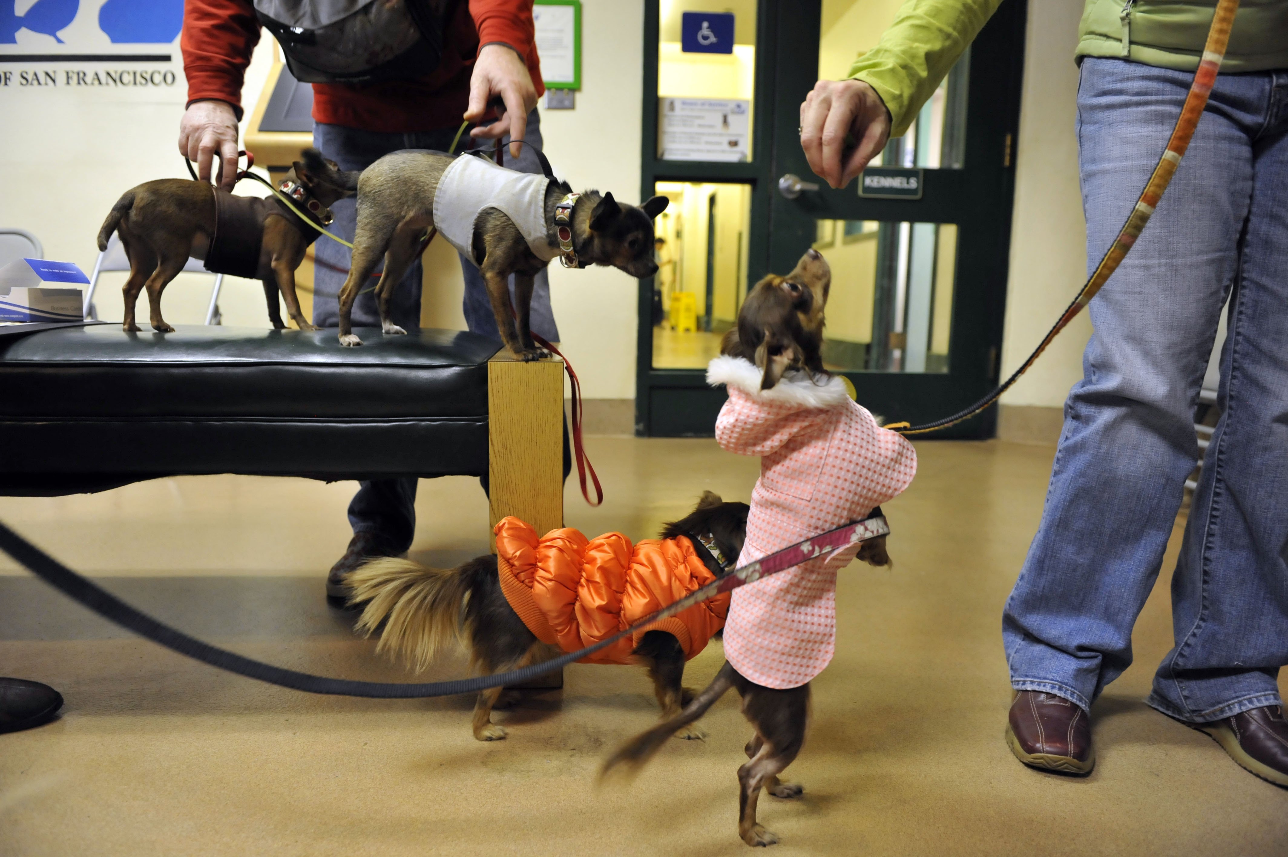 Dog owners and animal control workers show off Chihuahuas that have deluged the Bay Area’s animal shelters at the Animal Control and Care center in San Francisco earlier today. California has more Chihuahuas than it can handle. It’s gotten so bad in Oakland, they have started shipping them out of state, said Megan Webb, director of Oakland Animal Services. They have sent about 100 to Washington, Oregon and Arizona, she said, “and as soon as they get them, they are ready for new ones.” Chihuahuas make up 30 percent, 40 percent and even more of the dog populations at many California shelters. (AP Photo/Russel A. Daniels)
