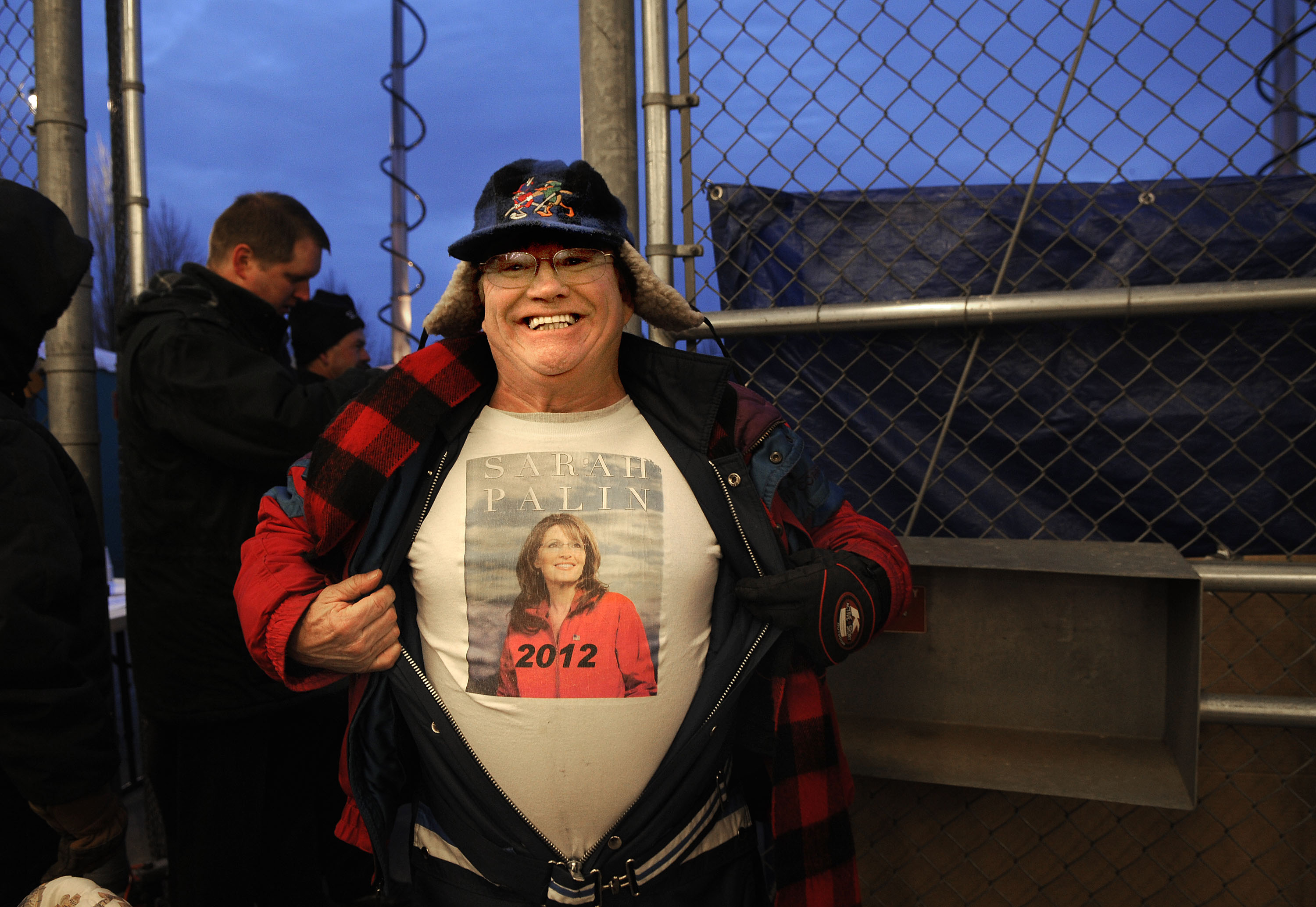 Ed Schaefer of Coeur d’Alene showed his support for Sarah Palin in the early morning hours of Thursday. He was in line to get his book signed at Fred Meyers in Coeur d’Alene. (Kathy Plonka/SR)