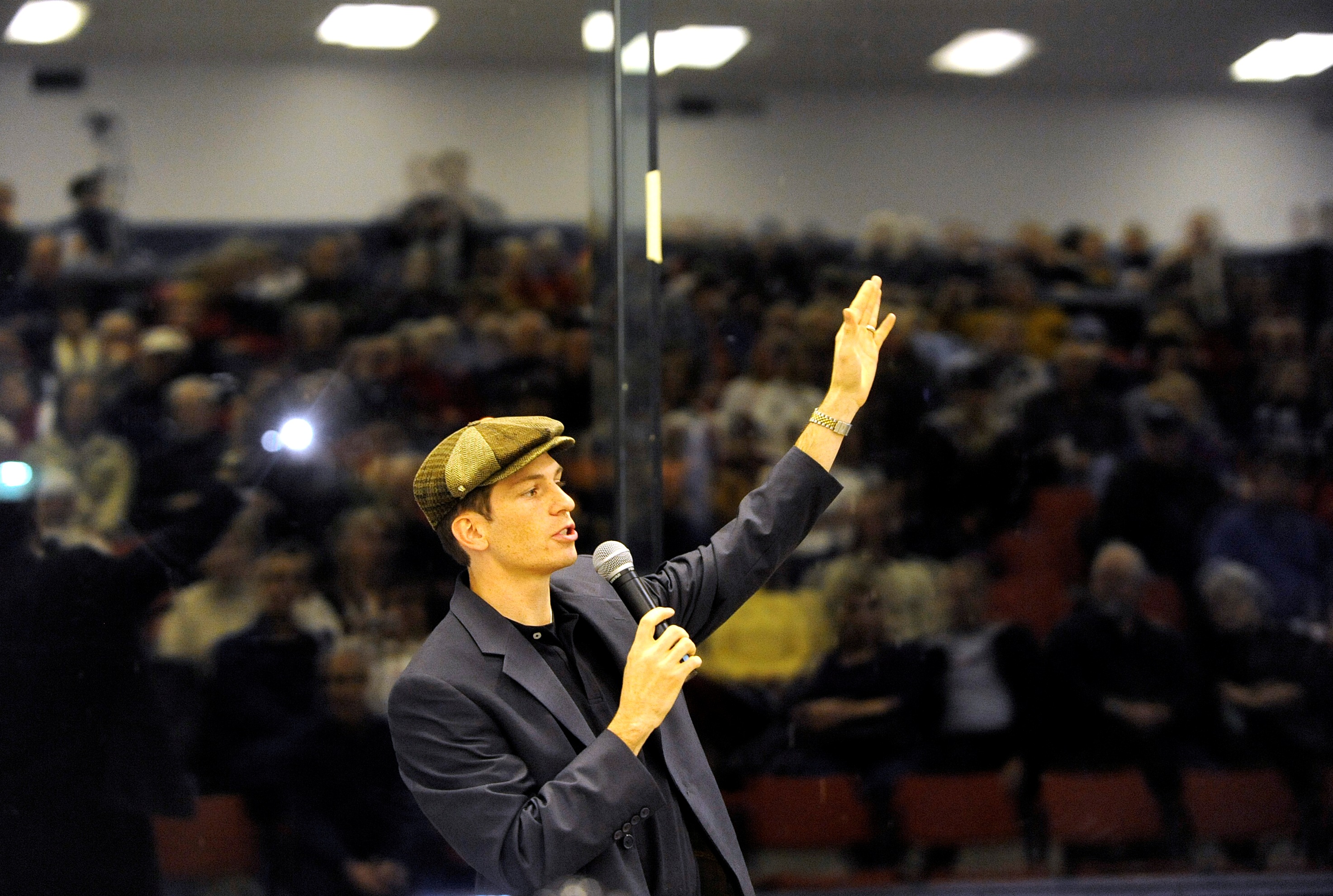Schaeffer Cox, a 25-year-old organizer from Fairbanks, Alaska, talks about how a movement sprang up in Fairbanks from a coalition of people disgusted with the government and the economic system while he was speaking Thursday, Dec. 2, at the Greyhound Park in Post Falls. Cox and other speakers appealed to the crowd at the Freedom Festival, a gathering of political groups to talk about grievances with the government. Afterward, many people asked Cox how to start a militia like he has helped organize in Alaska. Meghann M. Cuniff’s SR story here . (Jesse Tinsley/SR)
