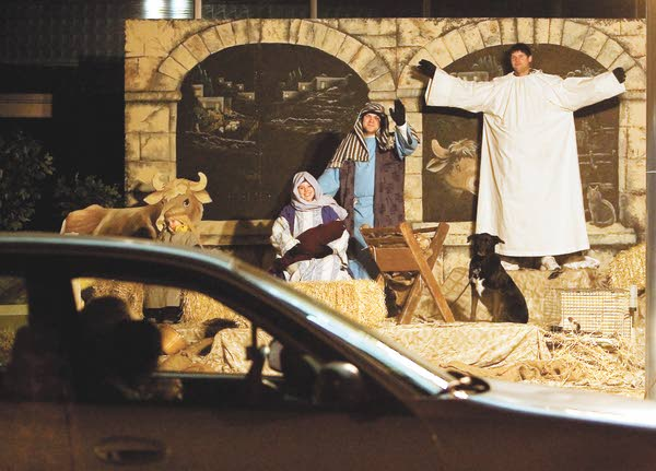 Mary and Joseph, center, played by Cassi and Dan Fitzgerald, plus the Angel Gabriel, right, played by Matt Horvath, and a shepherd, left, played by Shane Shaffer, wish happy holidays to travelers passing through the Living Faith Fellowship Living Nativity on Thursday in Pullman. (Dean Hare photo/Moscow-Pullman Daily News)