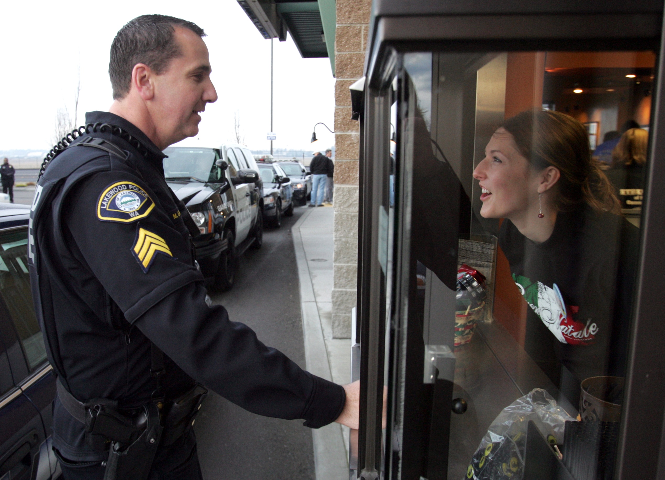 Lakewood police officer Mark Eakes is the first to place an order at the Forza Coffee Company drive thru in Parkland, Wash., which reopened at 8:14 a.m. Saturday, 13 days after four Lakewood police officers were fatally shot. A bagpiper played as the Forza Coffee shop opened its doors at 8:14 a.m., the time on Nov. 29 when Maurice Clemmons ambushed Lakewood Police Sgt. Mark Renninger and Officers Ronald Owens, Tina Griswold and Greg Richards.(AP Photo/The News Tribune, Janet Jensen)