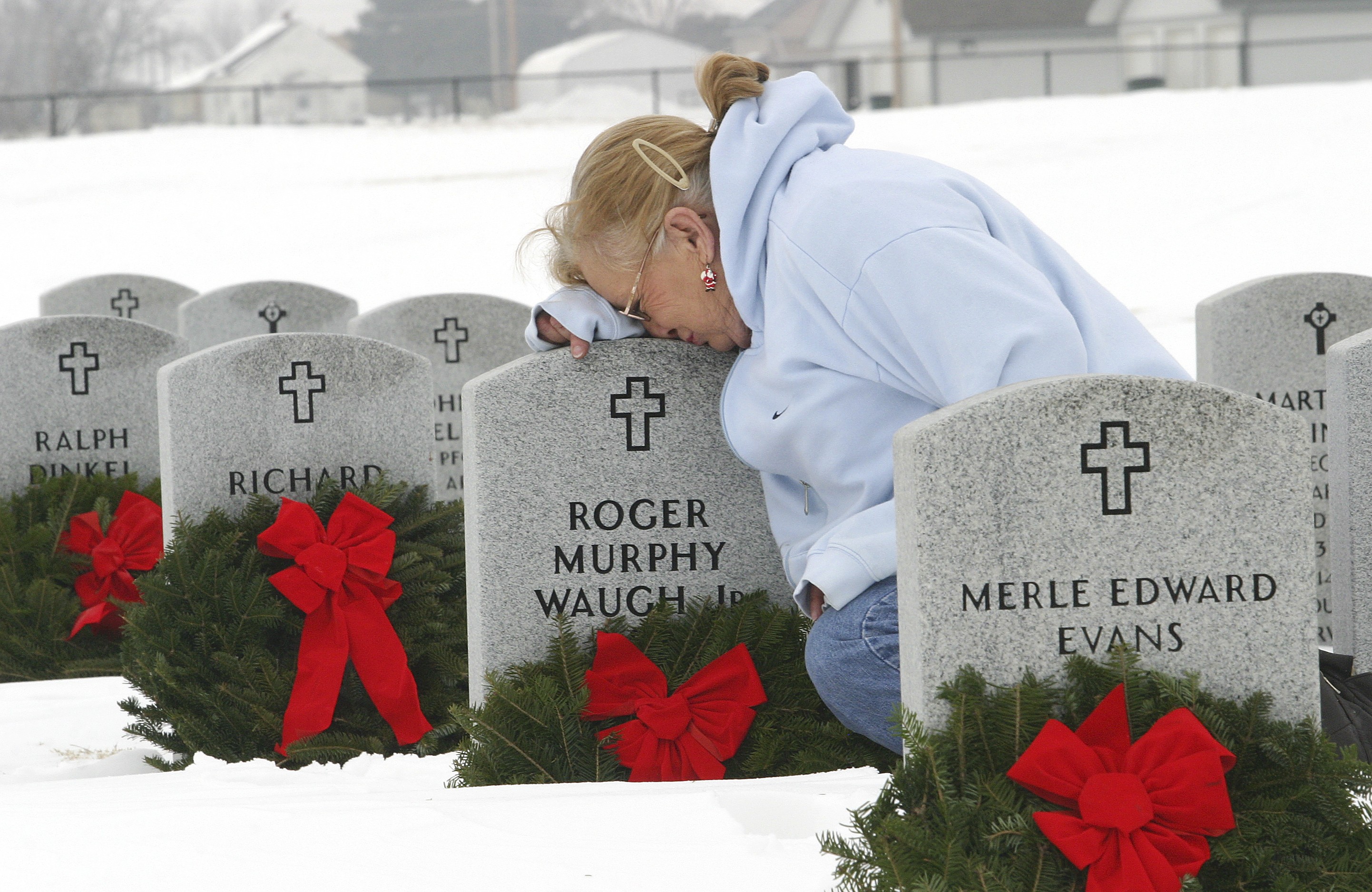 Gloria Waugh, of Ellsworth, Kan., mourns at the grave of her husband, Retired U.S. Air Force Master Sgt. Roger Murphy Waugh Jr., after placing a wreath on his headstone Saturday during the Wreaths Across America event at the Kansas Veterans’ Cemetery in WaKeeney, Kan. The Waughs had been married for 25 years, and he died in February. (AP Photo/Hays Daily News, Raymond Hillegas)