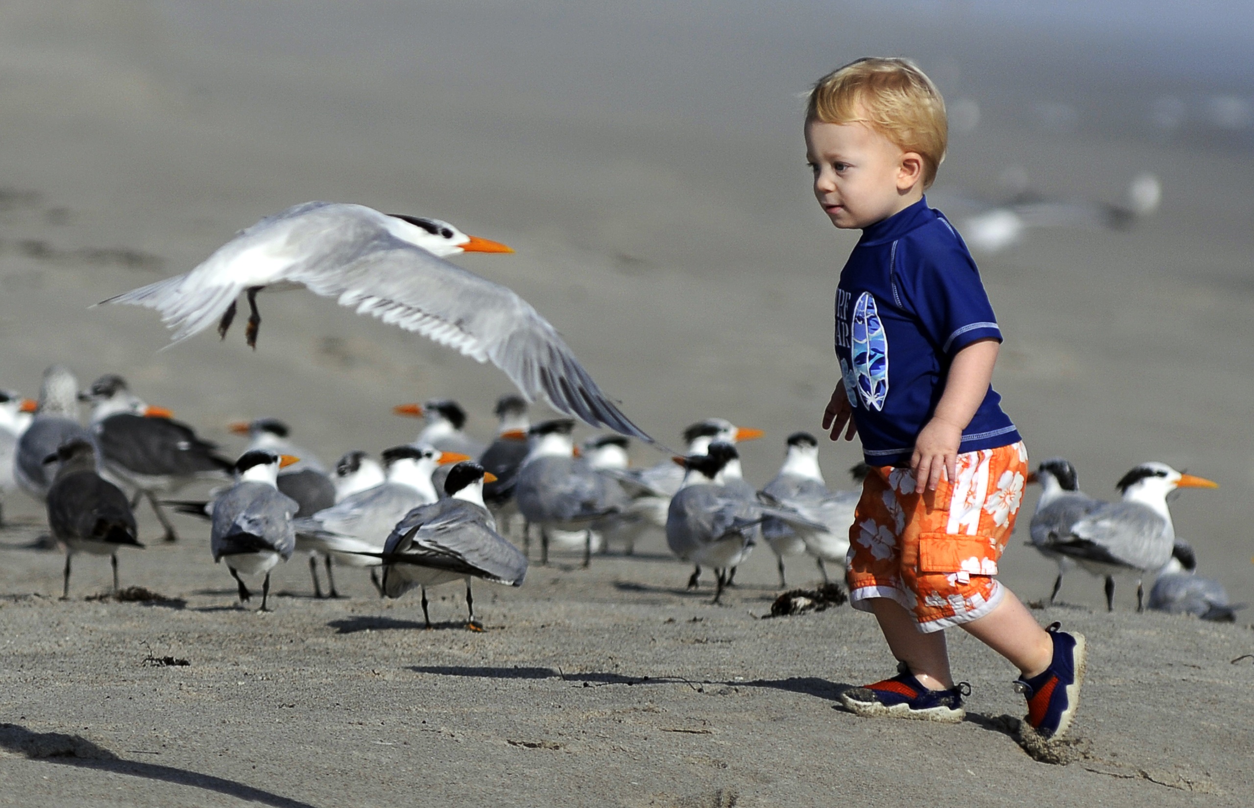 Dylan Gosewehr, 2, from Indiana chases shore birds at the Indialantic beach as his family visits relatives in Melbourne, Fla., Monday. They said they were enjoying the nice winter weather here where it was to reach the mid 80s while Indiana was in the low 40s. (AP Photo/Florida Today, Michael R. Brown)