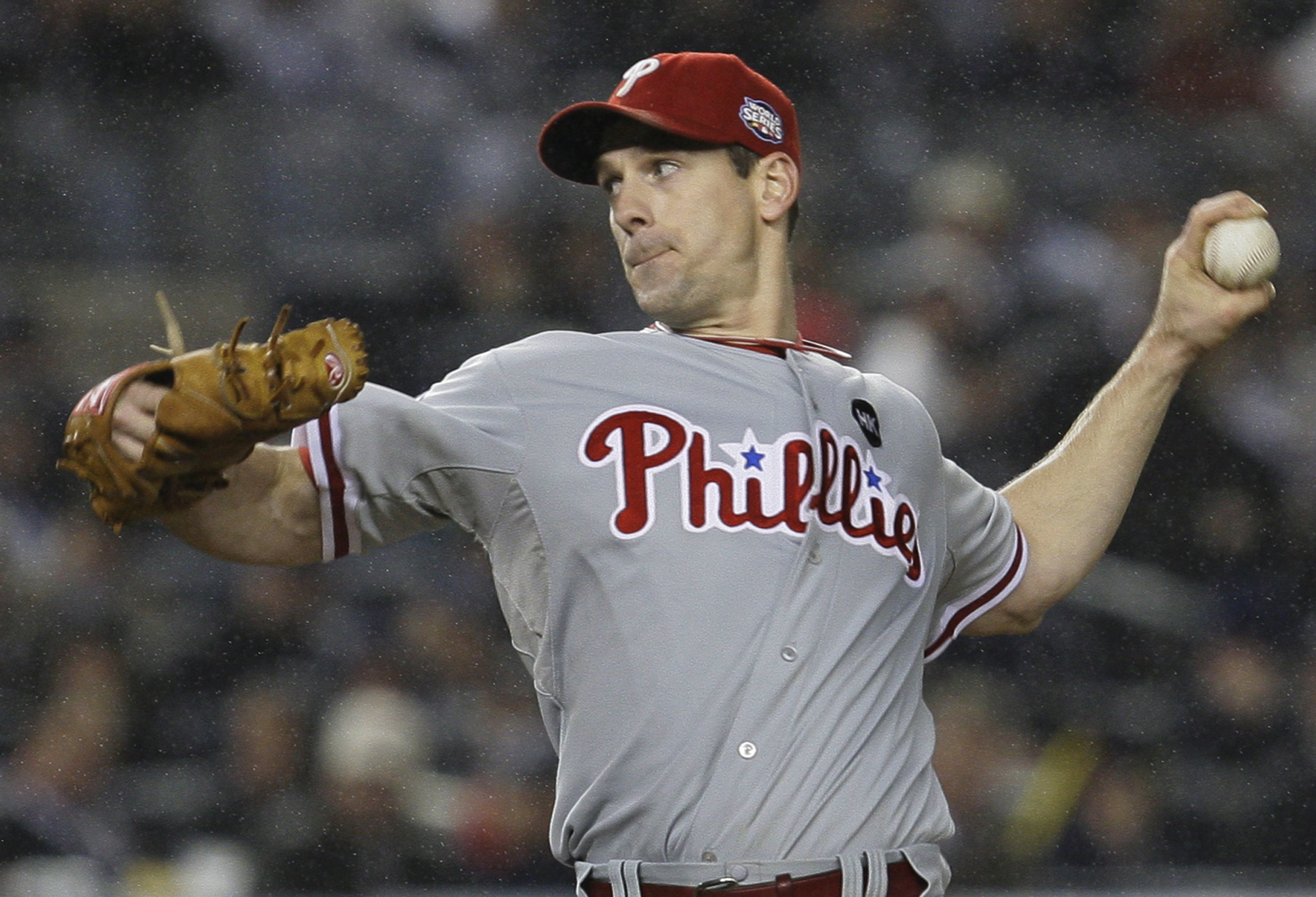 Philadelphia Phillies’ Cliff Lee pitches to the New York Yankees during the fifth inning of Game 1 of the Major League Baseball World Series on Oct. 28 in New York. Lee, a Cy Young Award winner, reportedly will be traded to the Seattle Mariners shortly which would give the Mariners a dominate one-two punch at the top of their pitching rotation with Felix Hernandez and Lee. ESPN story here . And: Seattle P-I story here . (AP Photo/David J. Phillip)