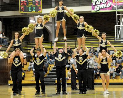 University of Idaho Cheerleading Squad performs during a recent basketball game with Sacramento State in Memorial Gym. (Kate Kucharzyk/Argonaut)